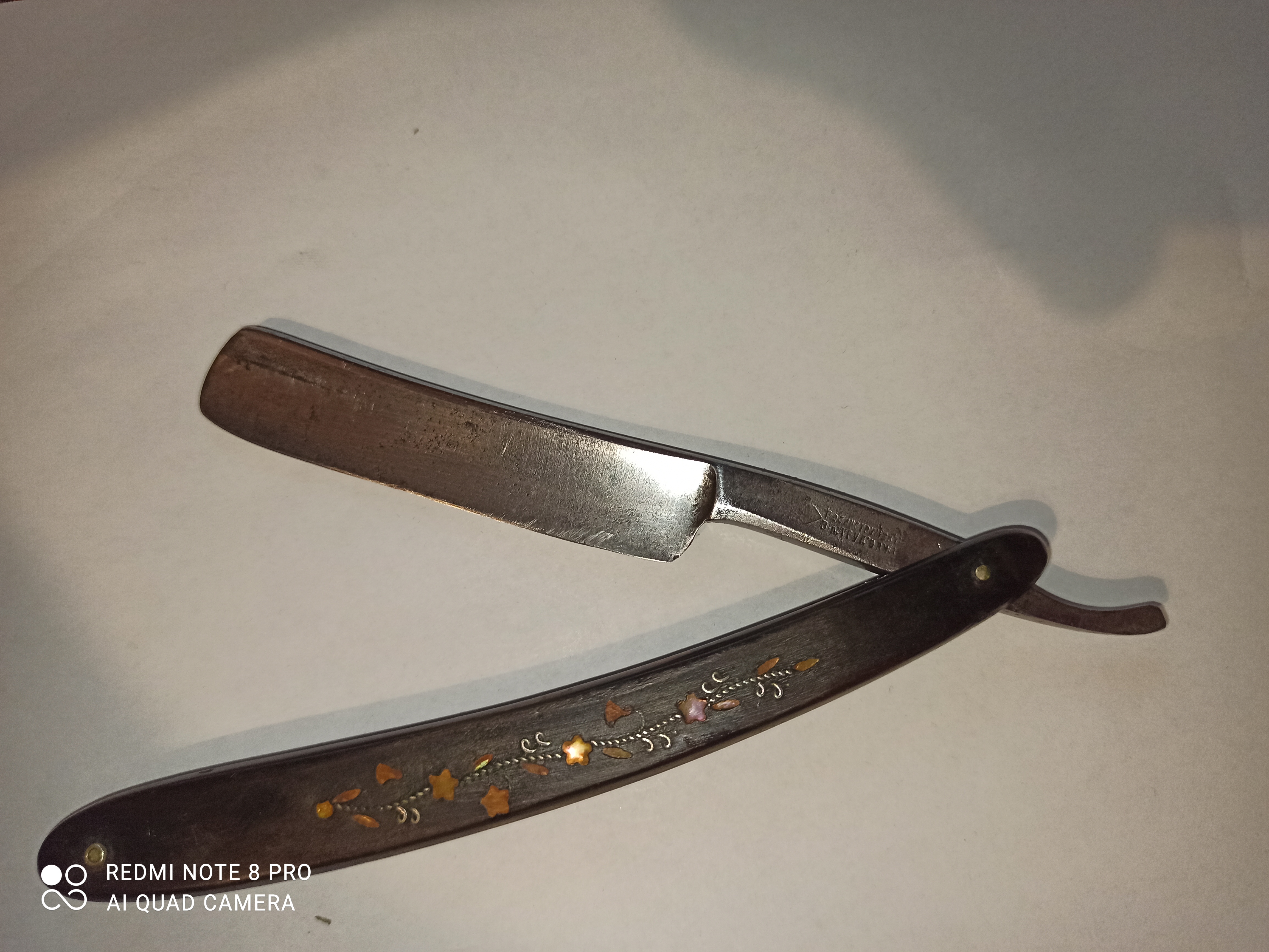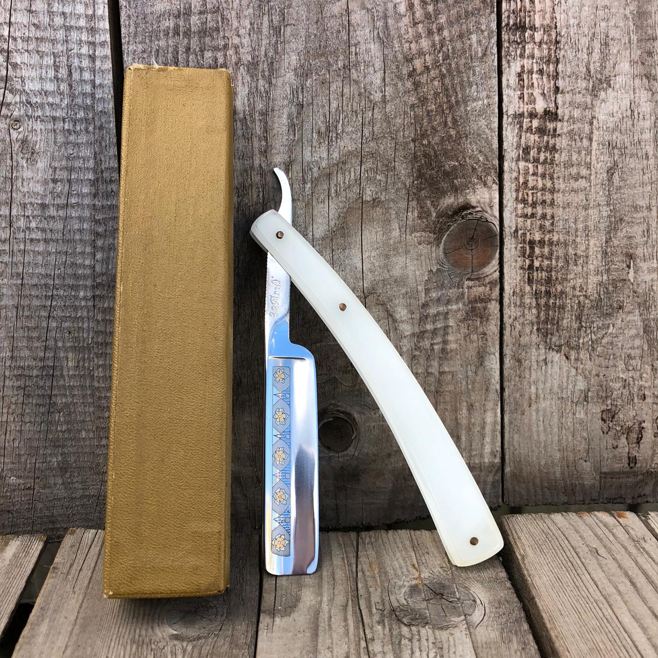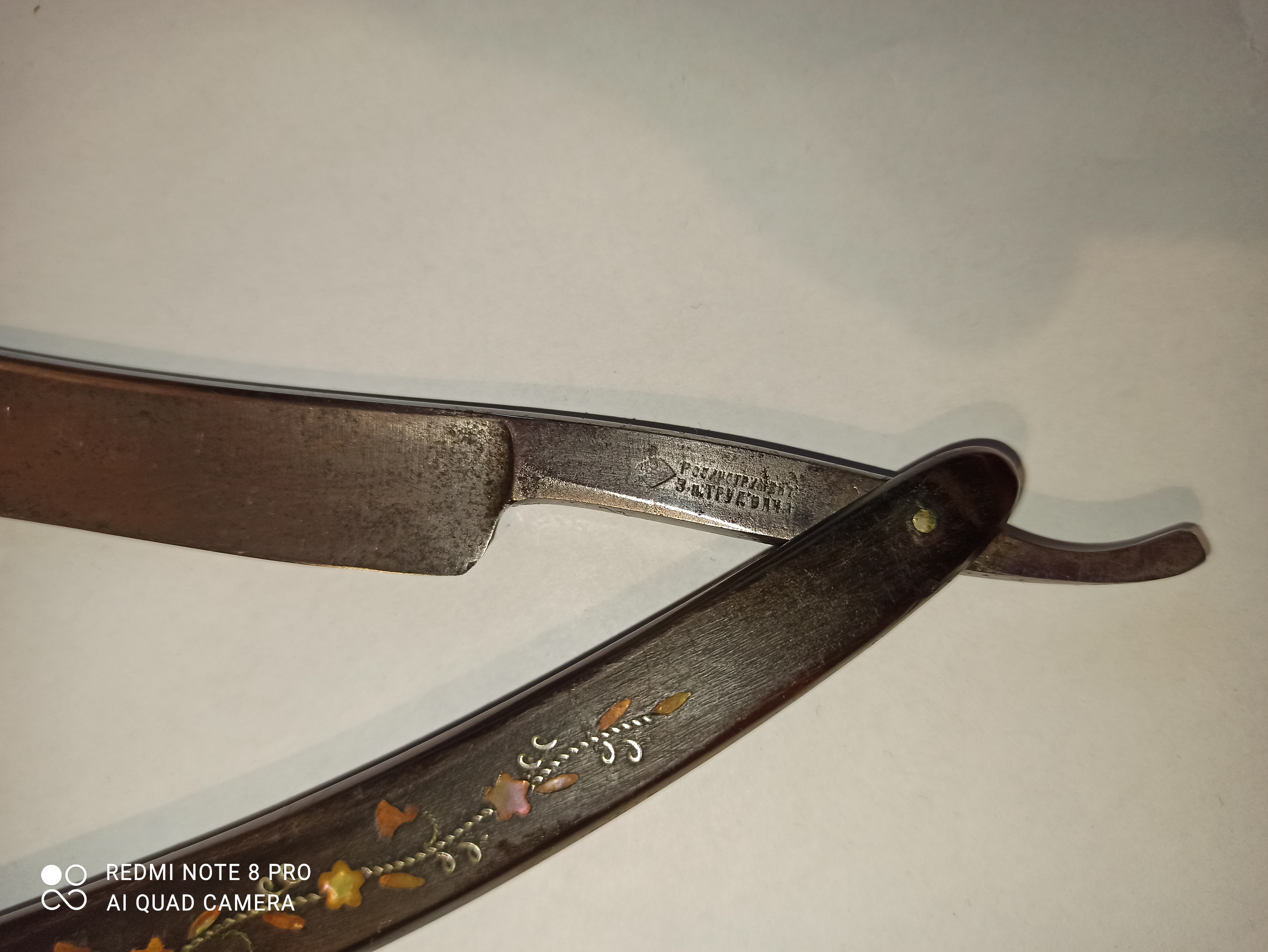 Здравствуйте. Прикупил вот такую бритву завода Труд. Судя по клейму 30-40-вые. Интересует ручка. Материал кость или рог, немного погрызана мышами.