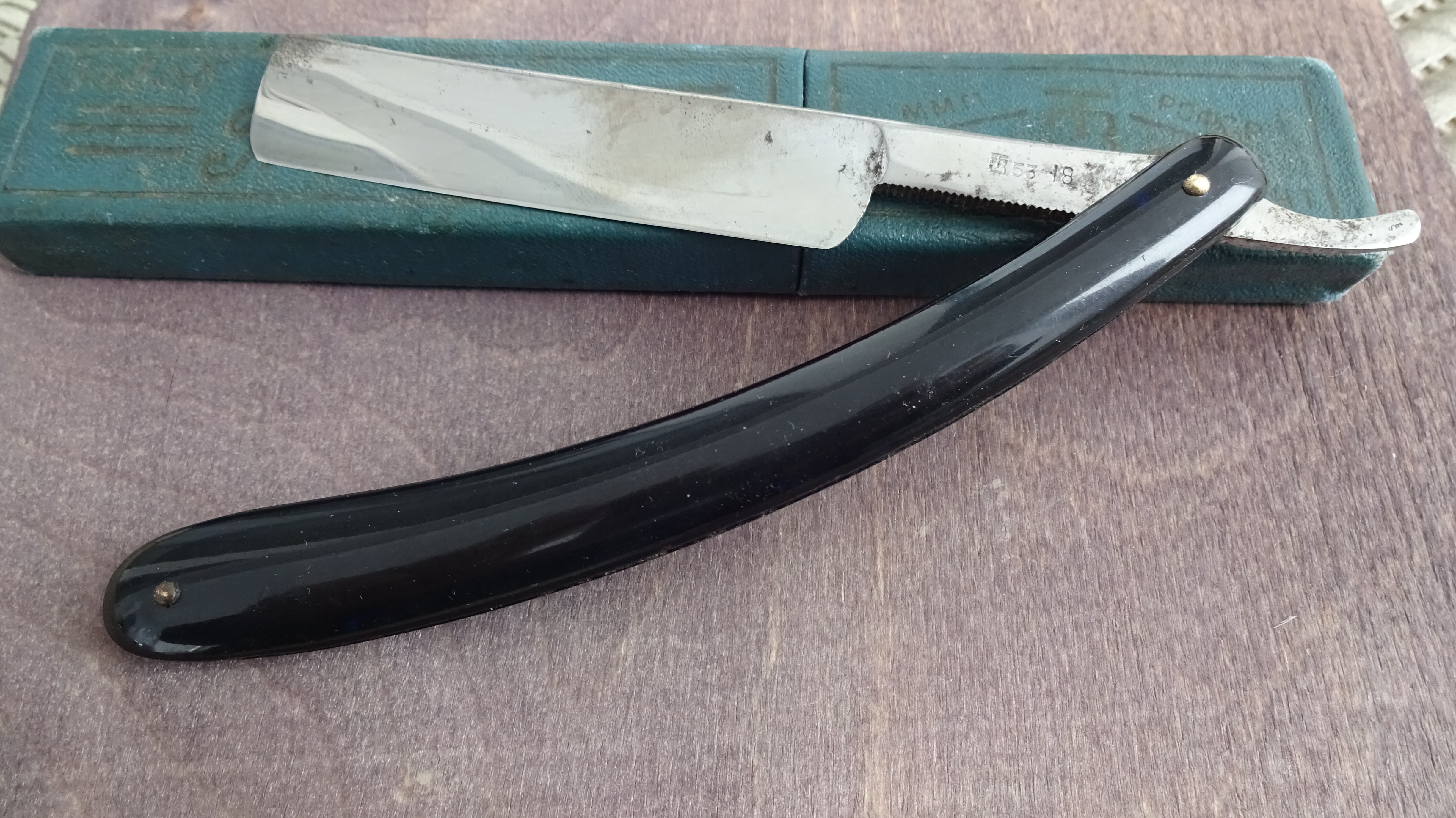 ЗТВ Подарок 56 г. Сюжет "Миру мир!", не частая бритва, барберский нос. Пришла в равномерной черной патине на всем полотне, и местами более серьезной коррозией, при таком раскладе всегда дилемма - почистить полностью и счистить гравюру или сохранить, при этом оставив где то следы или остатки. Считаю, что если гравюра повреждена безвозвратно, то счистить. Если можно как то сохранить, то это нужно сделать, без гравюры бритва теряет свою фишку. Чистил вручную, аккуратно, что то осталось по мелочи, но на мой вкус - не критично. Так же сохранил позолоту на обушке и носе