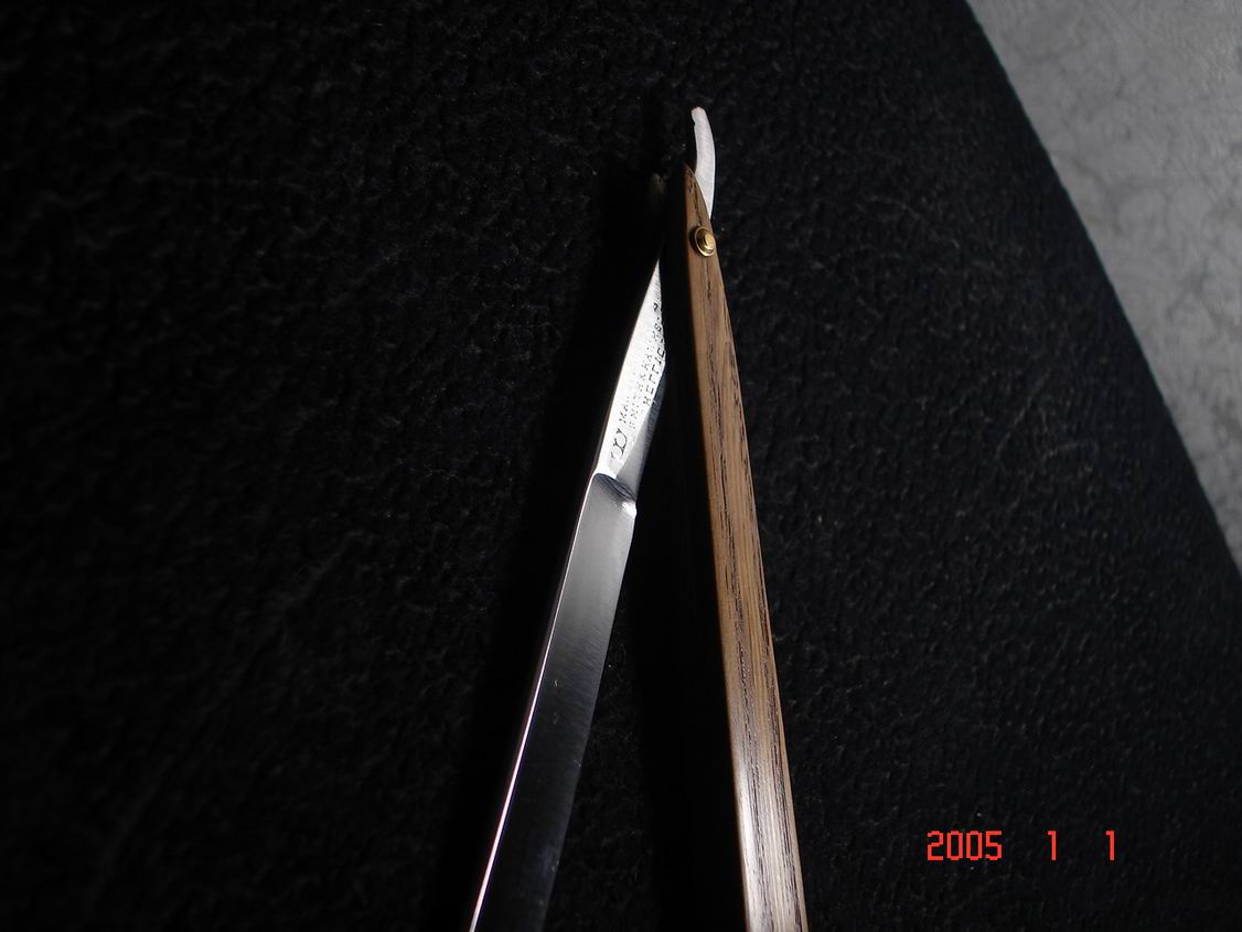 Скорее всего бритва в пользовании не была ,заводская шлифовка , бритва была разобрана , отполирована , ручка восстановлена , дополнил конструкцию шайбочками на осевом пине , что бы избежать трения ручки о полотно бритвы .