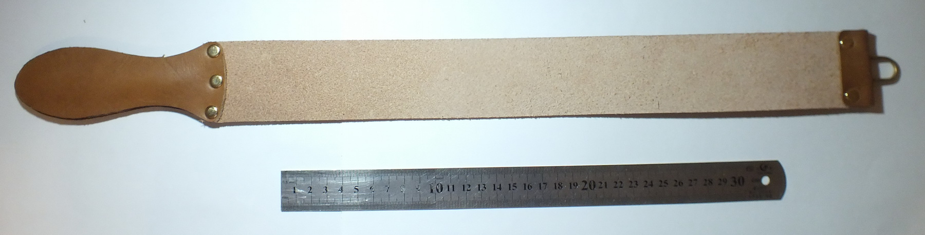 Кожа растительного дубления, высшего сорта из США (Herman Oak), Петля кожаная, ось - латунь. Размер 52мм на 62 см. Рабочая часть 41 см. Рукоятка "дутая" с пенопленовым вкладышем. Снято с продажи. Spoiler Show