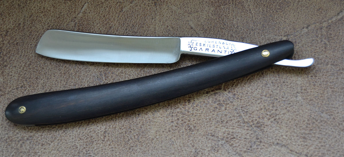 Швеция. Ширина 5/8. Рукоять из черной древесины, предположительно из эбена покрыта карнаубским воском. Шайбы родные. Заточена. Продано Spoiler Show