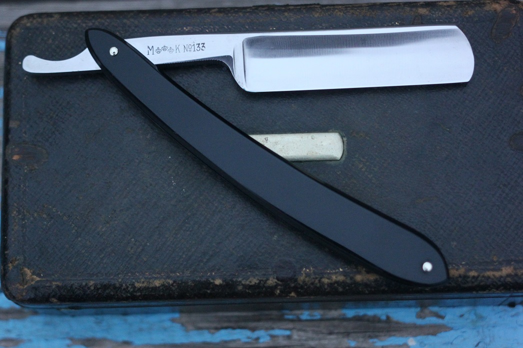 Re: Продаётся от KarangiWade and Butcher. Старая бритва. 5\8 На ерле присутствуют небольшие следы времени, при профилактики которых надпись стала просматриваться с трудом. Но, как писал форумчанин -"От этого он СтИзом не стал". Ручка рог в прекраснейшем состоянии. Интересная геометрия. Мощный обух (6 мм). Возле головы с лицевой стороны слегка неравномерная кромка (чуть шире). Бритва до заточки по всей видимости в использовании не была! Замечательный рез волоса. Заточка N*X*S. Продана
