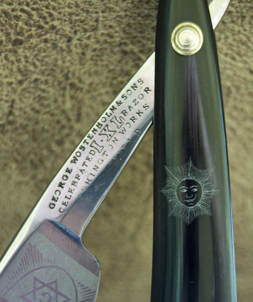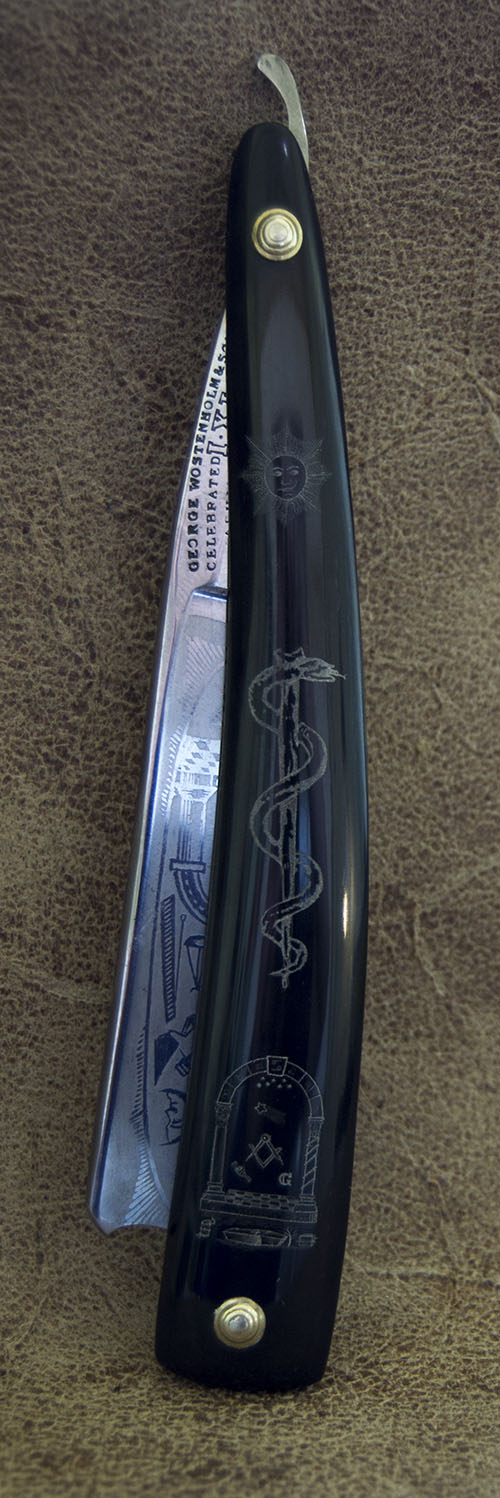 Жемчужина моей коллекции. George Wostenholm & Sons Бритва ориентировочно с 1848 (Год покупки Востенхольмом завода Washington Works) до 1860 гг. На полотне травление на масонскую тематику. Состояние самого полотна отличное, никаких следов заточки на обухе, бритва точилась мной впервые. Максимальная ширина 23.3 мм. Так же уникальность этой бритвы состоит в том, что за годы отслеживания это вообще единственный масон от Востенхольма, который я видел, тем более практически невозможно найти такую бритву в неиспользованном состоянии и без особых следов времени как это полотно. Сталь и геометрия выше всяких похвал, такую тонкую и равномерную кромку на клине 7/8 редко когда увидишь. По моему скромному мнению Масон от Wostenholm круче Масонских бритв от Wade & Butcher с похожим мотивом травления. Он шире, массивнее, форма полотна гораздо интереснее и травление хоть и менее глубокое, но более детализированное. Рукоять выполнена из черного рога буйвола. Рисунок нанесен в технике скримшоу известным мастером Сергеем Подварко(кому интересно можете погуглить.) Рисунок подчеркнуто простой, но не повторяющий полностью травление полотна. Продано Spoiler Show