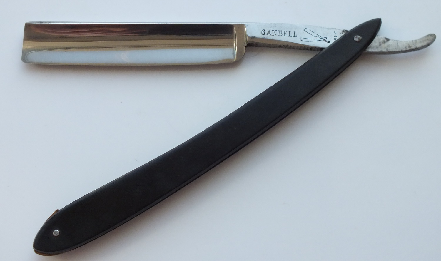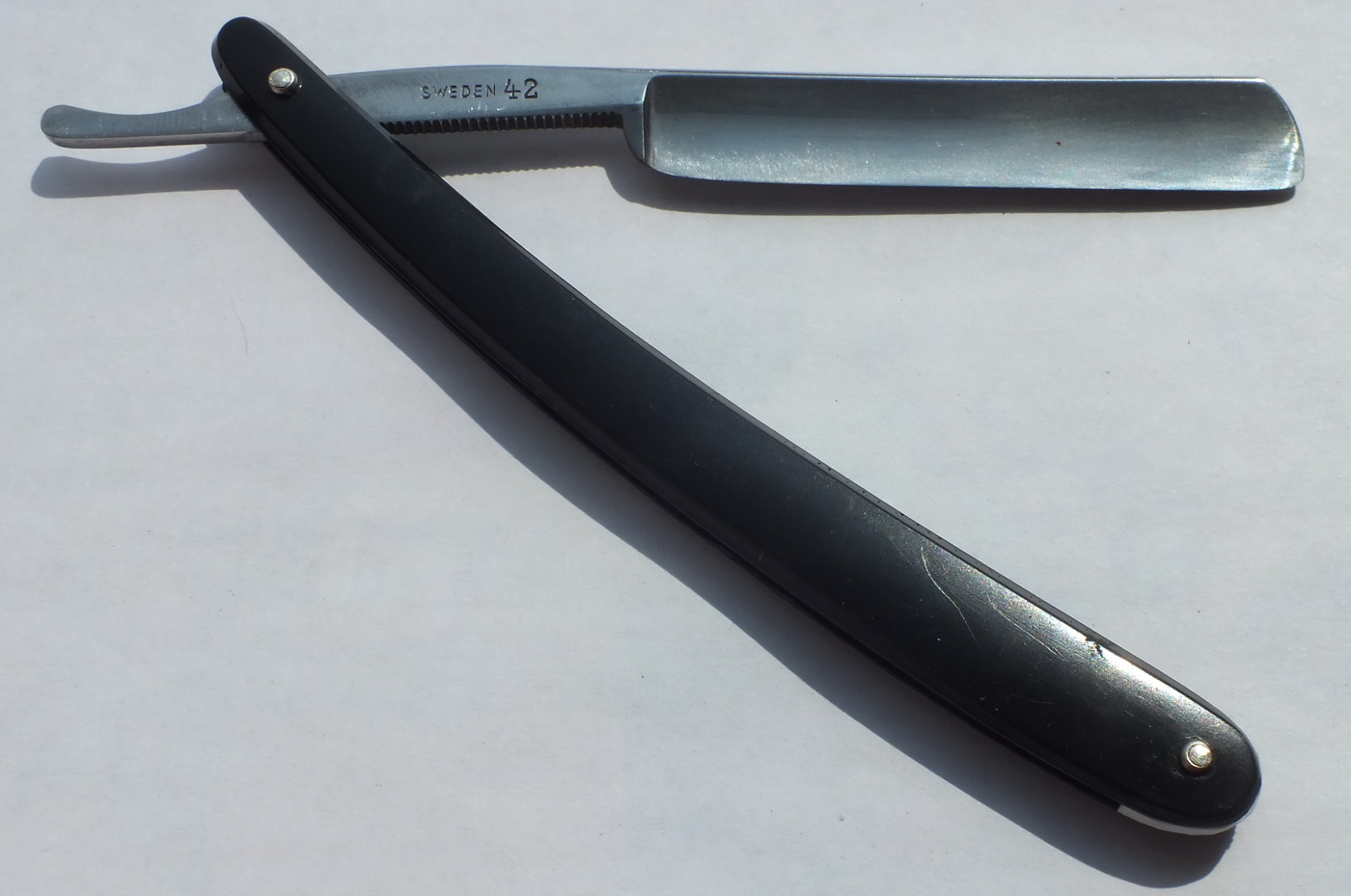 Оправа эбонит. Клинок углеродистая сталь. 11/16 Неар ведж. Размер 135х12,5х3,8 мм. Бритва заточена и готова к бритью. Цена: $60 с доставкой Spoiler Show