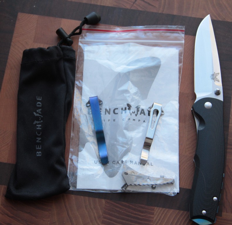 В комплекте:коробка, мануал по пользованию, дополнительные титановая клипса и спейсер, мешочек.Сталь 154 см.