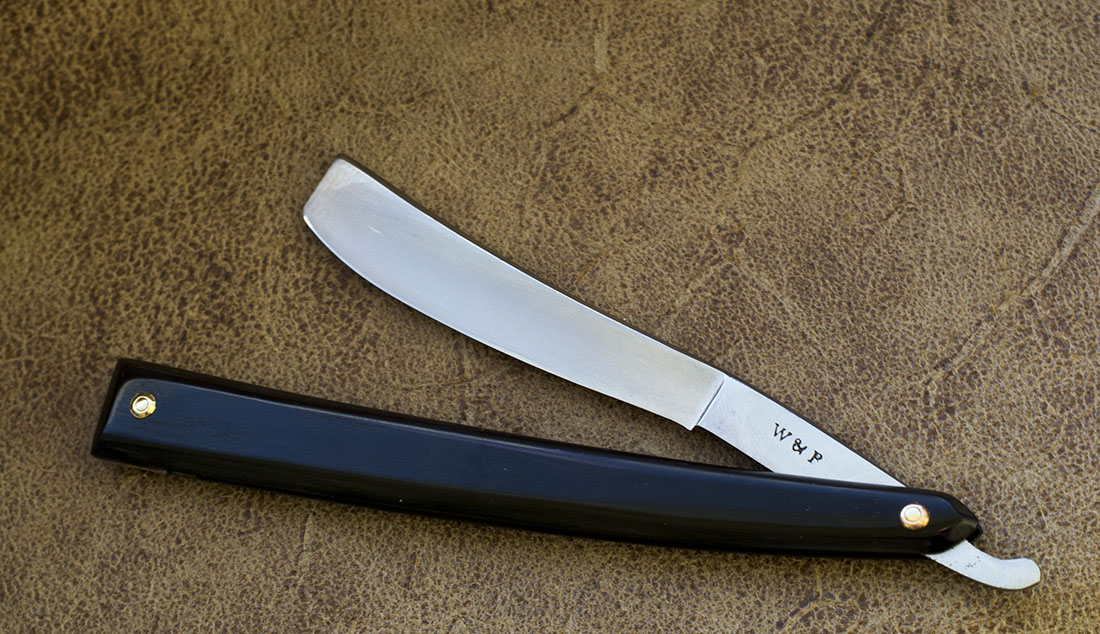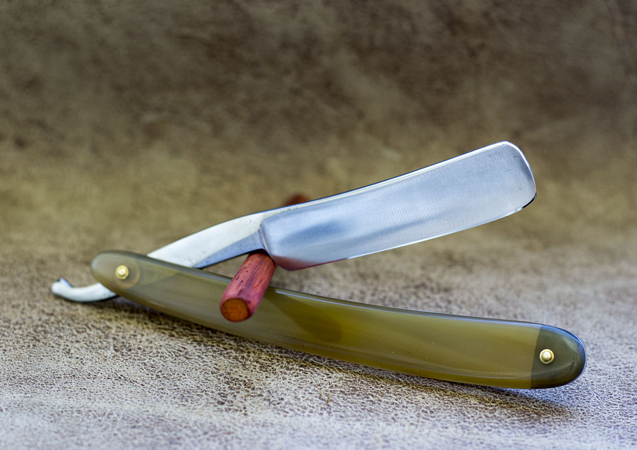 Ширина бритвы 18.5 мм. Новая роговая рукоять, обушок и эрл с дополнительными гранями, придающими неповторимую форму спинке. Бритва середины 19 века и как это часто бывает, рукоять не дожила до наших дней, была изготовлена новая из рога буйвола. Продано Spoiler Show