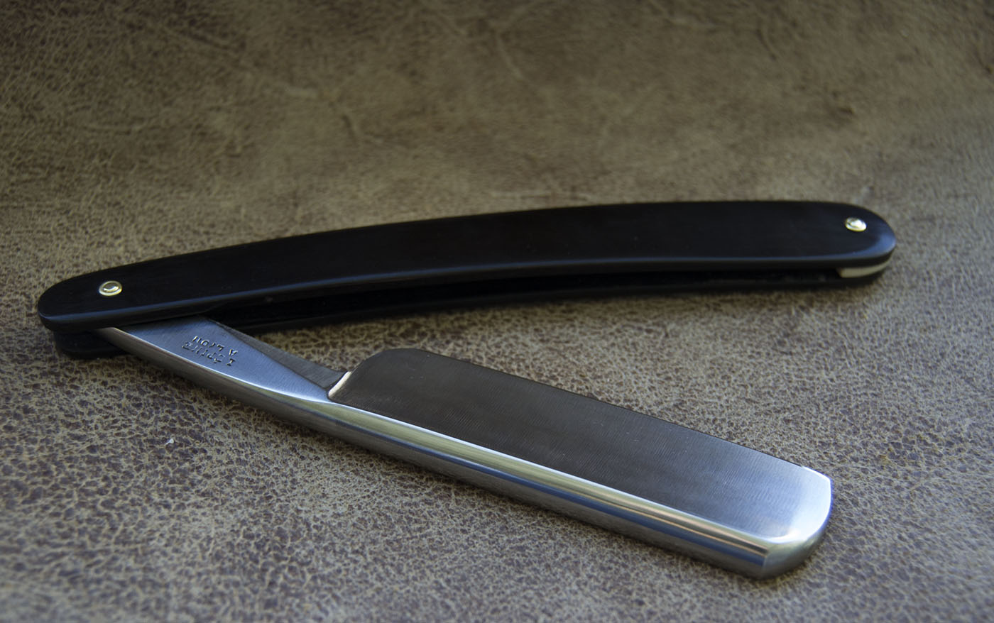 Ширина бритвы 18.5 мм. Новая роговая рукоять, обушок и эрл с дополнительными гранями, придающими неповторимую форму спинке. Бритва середины 19 века и как это часто бывает, рукоять не дожила до наших дней, была изготовлена новая из рога буйвола. Продано Spoiler Show