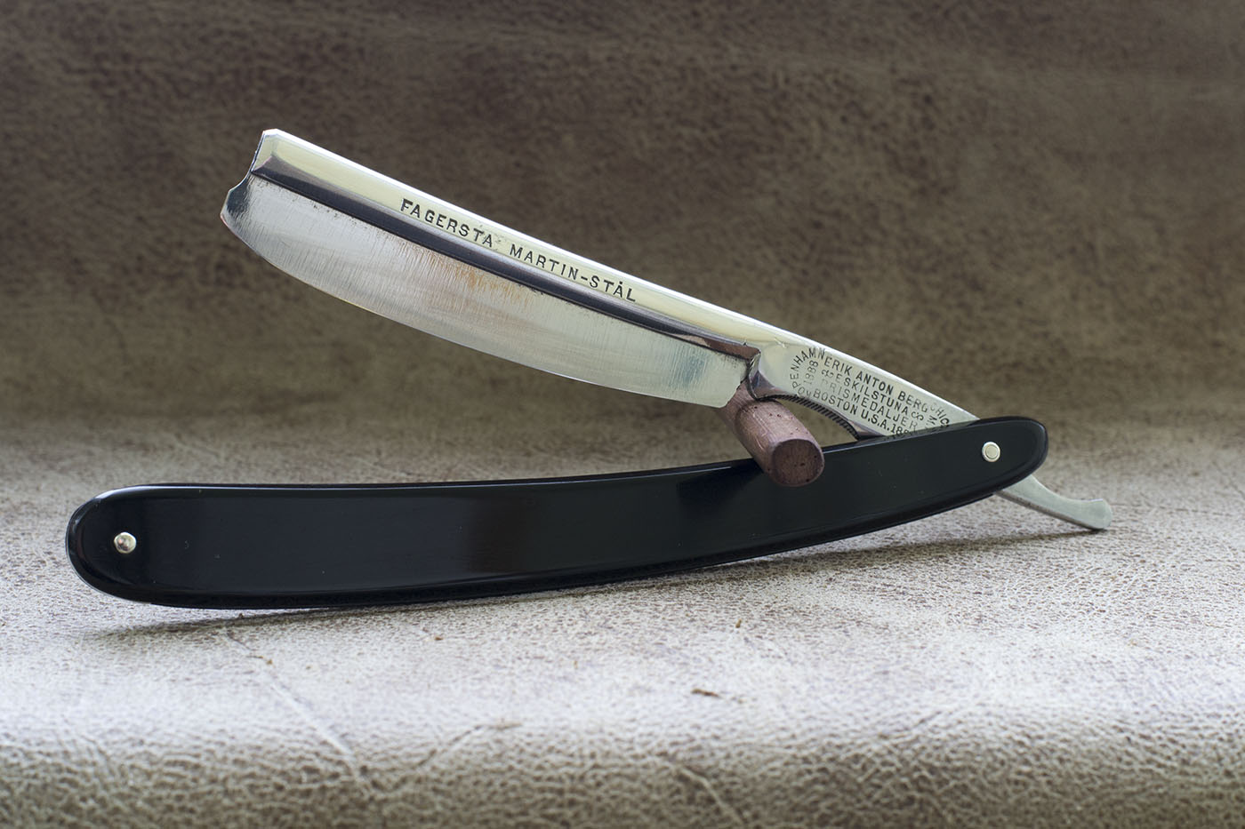 Опасная бритва от именитого шведского производителя, изготовлена из так называемой Fagersta Martin Stal - Мартеновская Сталь полученная в местечке Fagersta. Фагерста была местом производства стали в центральной Швеции, начиная с 17 века. Как понятно из надписей на эрле - производитель неоднократно удостаивался наград за свою продукцию на индустриальных выставках в Швеции, в частности на бритве есть упоминание о Золотой медли на выставке в Стокгольме в 1897 году, на спинке так же есть данные о патенте. Бритва имеет ширину в 6/8 дюйма в самом широком месте (18.8 мм) Бритва не была в использовании, имеет отличную геометрию. Мною проведена разборка, полировка полотна и заточка. Бритва полностью готова к бритью. Сталь полотна гораздо тверже стали обуха, поэтому бритва заточена с изолентой. Бритва годится для новичка, но так же предпочтительная для коллекционера. Старые шведские фреймы с таким количеством пояснительных клейм являются довольно редкими. Продано Berg Show
