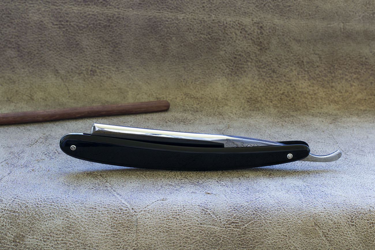 Лук (Bow) от Wade & Butcher. Модель хоть и двольно старая (видел образцы прим. середины 19 века) но не слишком распространенная. Тем более мало живых луков осталось в открытой продаже. Ранние луки имели расширение полотна от пяточки к носику и прямую спинку, более поздние стали выглядеть как классические холоуграунды, т е полотно не расширялось. Данная бритва как и старые классические луки имеет расширение от пятки к носику, но клеймо England говорит о том что бритва скорее всего периода конца 19 века. Примечательно что спинка бритвы не расширяется вместе с полотном, т е на разных участках полотна мы получаем разный плавно меняющийся угол заточки, что никак не влияет на качество или комфорт бритья - оно у луков от Wade&Butcher превосходное. Бритва заточена и готова к бритью. Ширина 20.5 мм. Изготовлена новая рукоять из рога буйвола. Продано Spoiler Show