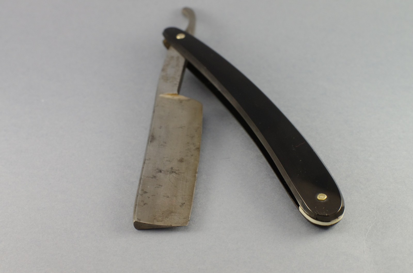 Бритва полностью в рабочем состоянии. Ручка целая, ровная, клинок паркуется по центру, без закусываний. На осевом пине сидит достаточно плотно, под собственным весом не вываливается. Парковка сделана утыканием носика бритвы в клинышек ручки. Насечка с двух сторон эрля. Длина рабочей кромки 8 см. Длина ручки 15 см, длина клинка 14,5. Обух 5+ мм. Увесистая бритва, 54 грамма.