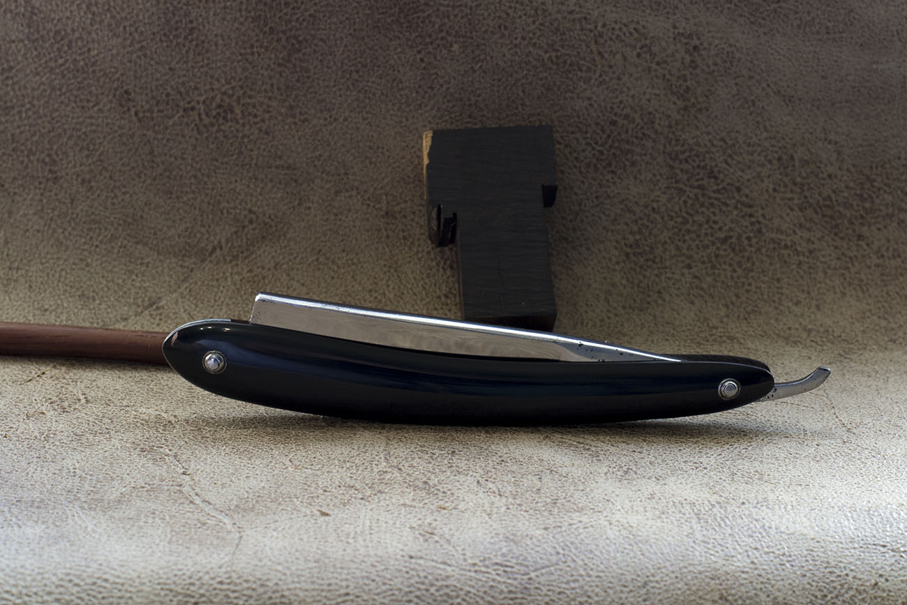 Рад представить крайне интересный французский фреймбэк от одного из наиболее известных и старых производителей бритв во Франции. Для меня Dumas 32 более известен как изготовитель бритв с вогнутостью клин от начала до середины 19 века, с разной шириной полотна, хвостовиком разного вида или вовсе без него. Во время поисков информации, наткнулся так же на интересные сведения о том, что фирма существовала как производитель ножей и различного режущего инструмента, по некоторым данным, является наиболее старым, в Тьер, брендом данной направленности, основание которой восходит аж к 16 веку. Кроме того марка существует по сей день, продолжая выпуск своей продукции, о производстве опасных бритв конечно же речь не идет. Фреймбэк является редкой формой полотна для данного изготовителя, на моей памяти это и вовсе первый образец попавший ко мне в руки. Кроме того, форма не совсем типична для французских фреймбэков и скорее отдаленно напоминает шведские бритвы подобного формата. Ширина полотна 19.5 мм, воронение. Родная роговая рукоять, которую удалось выпрямить, но в дальнейшем нет никаких гарантий от небольшого искривления. Клинышек –кость. Отличная сталь и хорошая геометрия, бритва заточена и готова к бритью. Продано Dumas Show