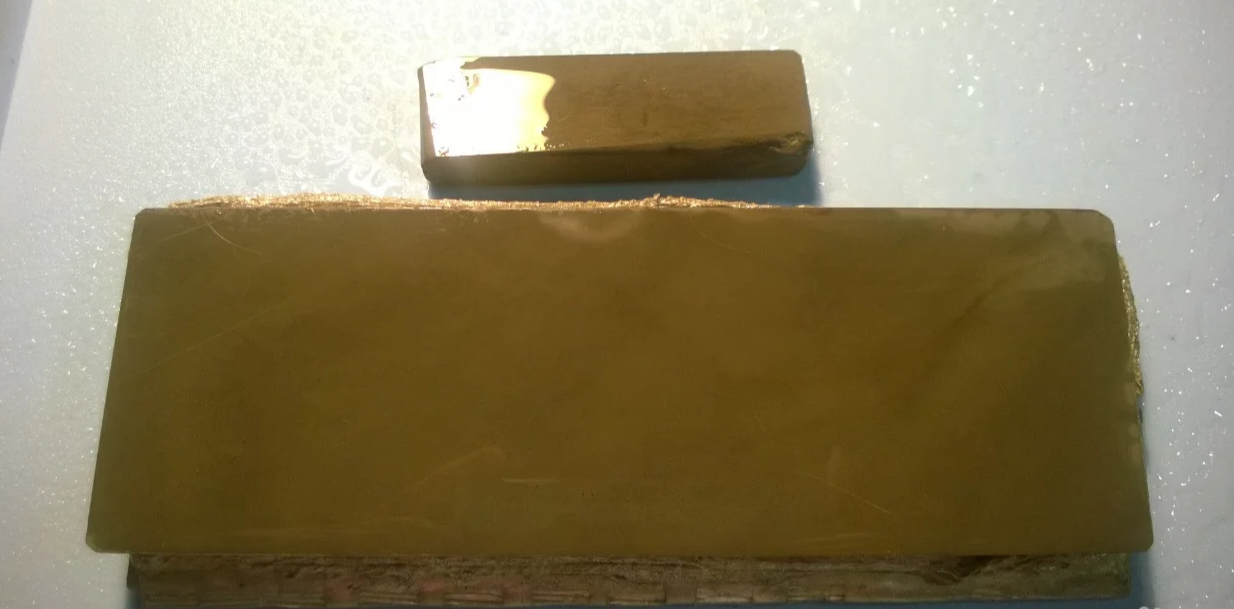 Габариты: 175мм длина, 60мм ширина, толщина 10мм(самая толстая часть)-4мм(самая тонкая часть). Гритность: 8000 - 10000 (если сравнивать с японскими искусственными камнями). Так как камень тонкий, то для надежности приклеил алюминиевую пластину на эпоксидную смолу. На фото камень в сухом и мокром состоянии. Покупался у Немца(кто не знает - спросите у форумчан). Цена 3500р.