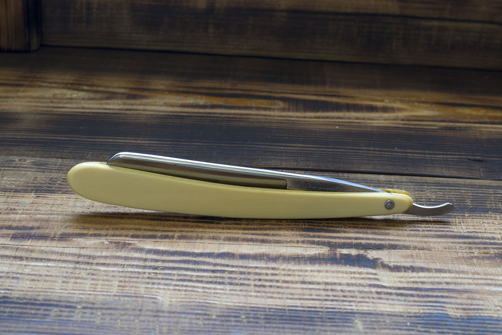 Германская бритва второй половины 20 века изготовленная из фирменной нержавеющей стали Friodur от компании Henckels. Об особенностях данной стали мало что известно, кроме того что запатентована в 1965, содержит неизвестное количество легирующих элементов - хрома и углерода и поддвергается фирменной криозакалке. По факту это дает режущие свойства сопоставимые с бритвами из углеродистой стали, кроме того обеспечивает высокую сопротивляемость коррозии, именно поэтому эти бритвы можно рекомендовать новичкам, людям ищущим командировочную бритву или просто всем кто не хочет следить за полотном. Данные бритвы хорошо хранятся в ванных комнатах и другх местах с повышенной влажностью. Рукоять бритвы изготовлена из целлулоида, родная по всей видимости была утрачена в давние времена. Полотно практически не точилось, никакого абразивного воздействия с моей стороны кроме легкой полировки и заточки. Бритва заточена и готова к бритью. Продано Friodur Show