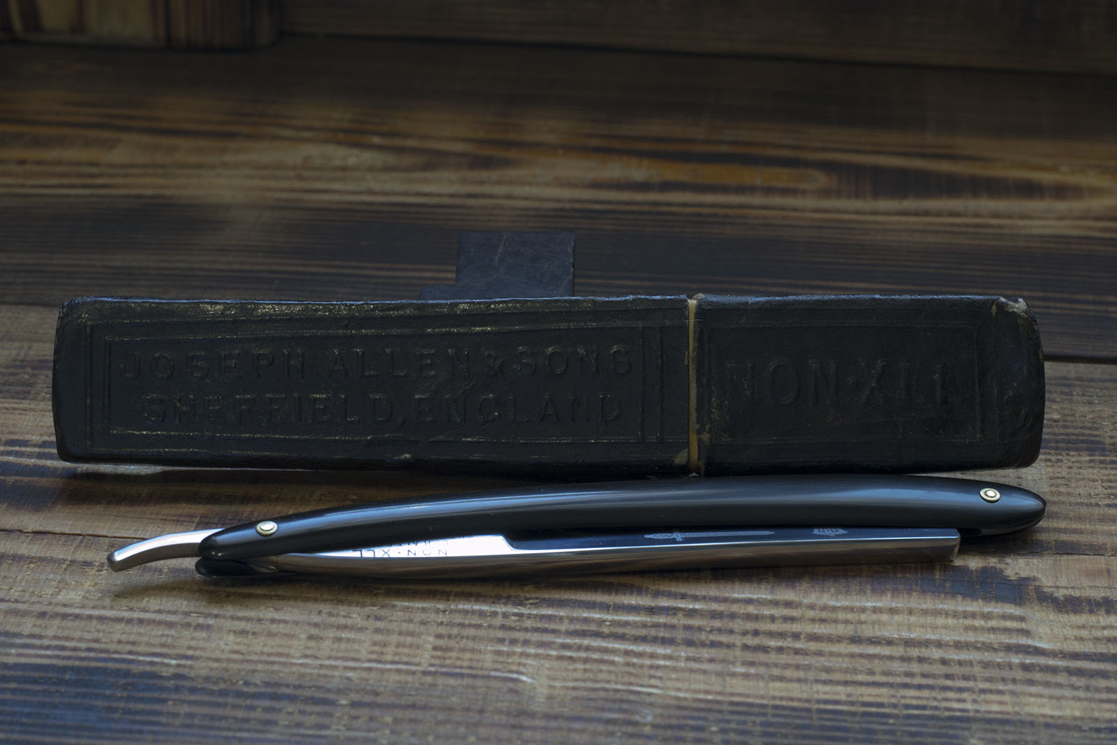 Шеффилдская опасная бритва от известного и почитаемого производителя - Джозефа Аллена торговой марки NON-XLL, кроме того на полотне так же присутствует изображение меча, что так же является торговой маркой Аллена с начала 20 века. Судя по всему бритва выпущена и посвящена коронации Эдварда VII - короля Великобритании, Ирландии и императора Индии. Крайне редкая бритва встречаемая мной впервые, в то время бритвенная промышленность пошла на спад и выпуск, вероятно, не был велик. Ширина полотна - 5/8+ (17.5 мм) родная эбонитовая рукоять, качественная шеффилдская углеродка, хорошая геометрия полотна, фаска режущей кромки с лицевой стороны более широка чем с обратной, но это не имеет особого значения кроме фактора эстетики, родная коробка так же в комплекте. Бритва заточена и готова к бритью - редкий экземпляр в коллекцию и хороший инструмент для новичка. Продано NON XLL Show