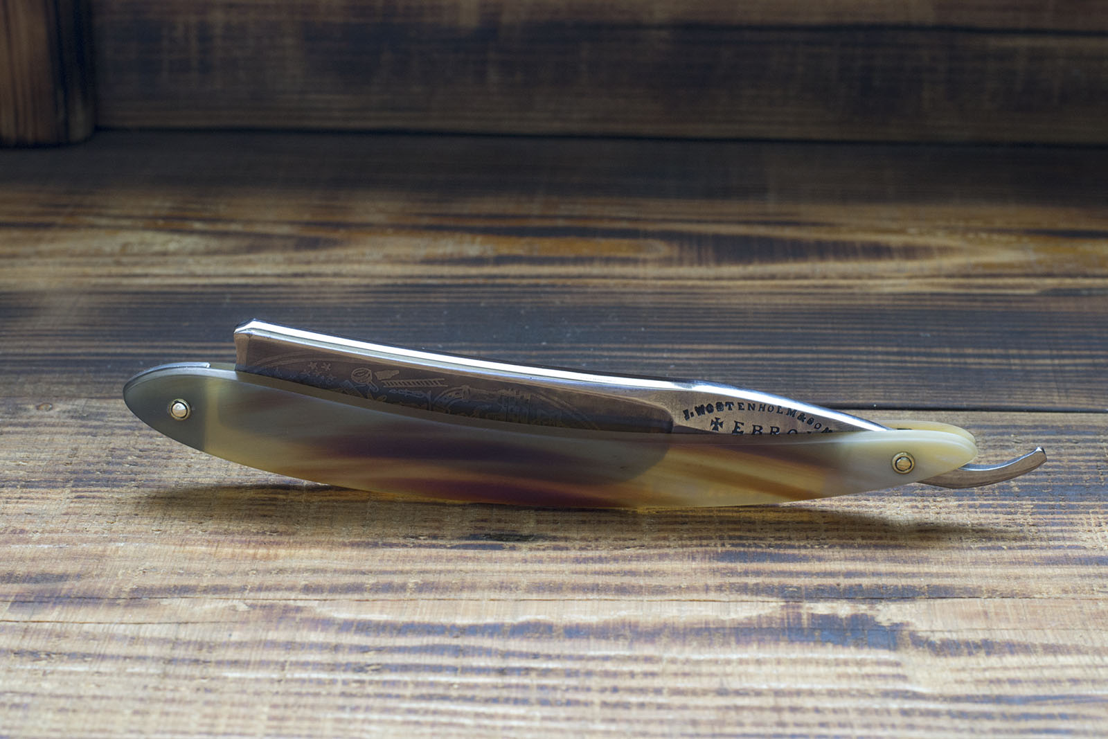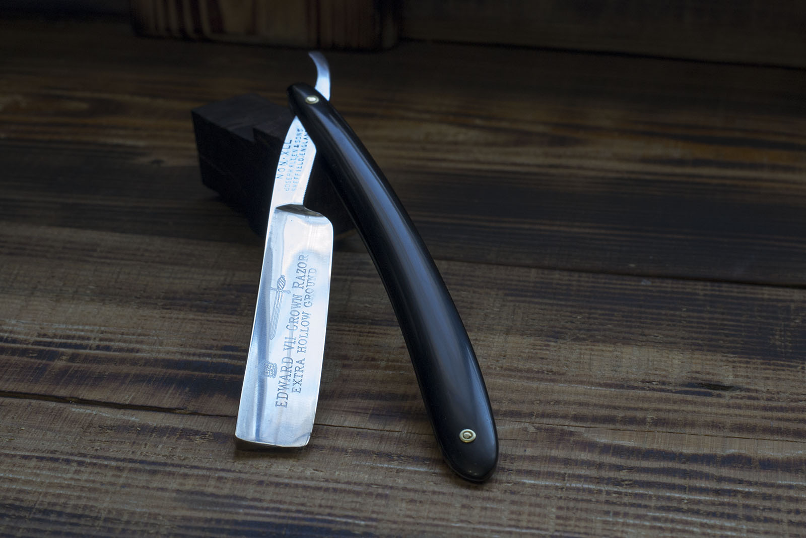 Опасная бритва от Джозефа Востенхольма торговой марки Ebro. Бритва имеет довольно скромные размеры в 5/8 (16.6 мм.), вогнутость полотна примерно 1/2, роговая рукоять, немного длинная, но я уверен что родная, так как не было замечено каких либо следов перестановки - оба пина были одинаковыми, аутентичные латунные шайбы, которые удалось сохранить. Бритва точилась мало и аккуратно, поэтому размер полотна близок к оригинальному. На эрле присутствует клеймо England, что может смутить любителей датировки бритв по Standart Guide, несмотря на его наличие я уверен что бритва выпущена ранее 1890-х, а именно дата выпуска примерно 1860 - 70 гг, об этом говорит и период работы фабрики, и форма полотна в сочетании с материалом рукояти. Бритва имеет прекрасную геометрию - фаска тонкая и равномерная по всей длине, углеродистая сталь высокого качества хорошо проявившая себя в заточке. Бритва крайне интересна, особенно рекомендую новичкам, так же будет удобна при окантовке. Продано EBRO Show
