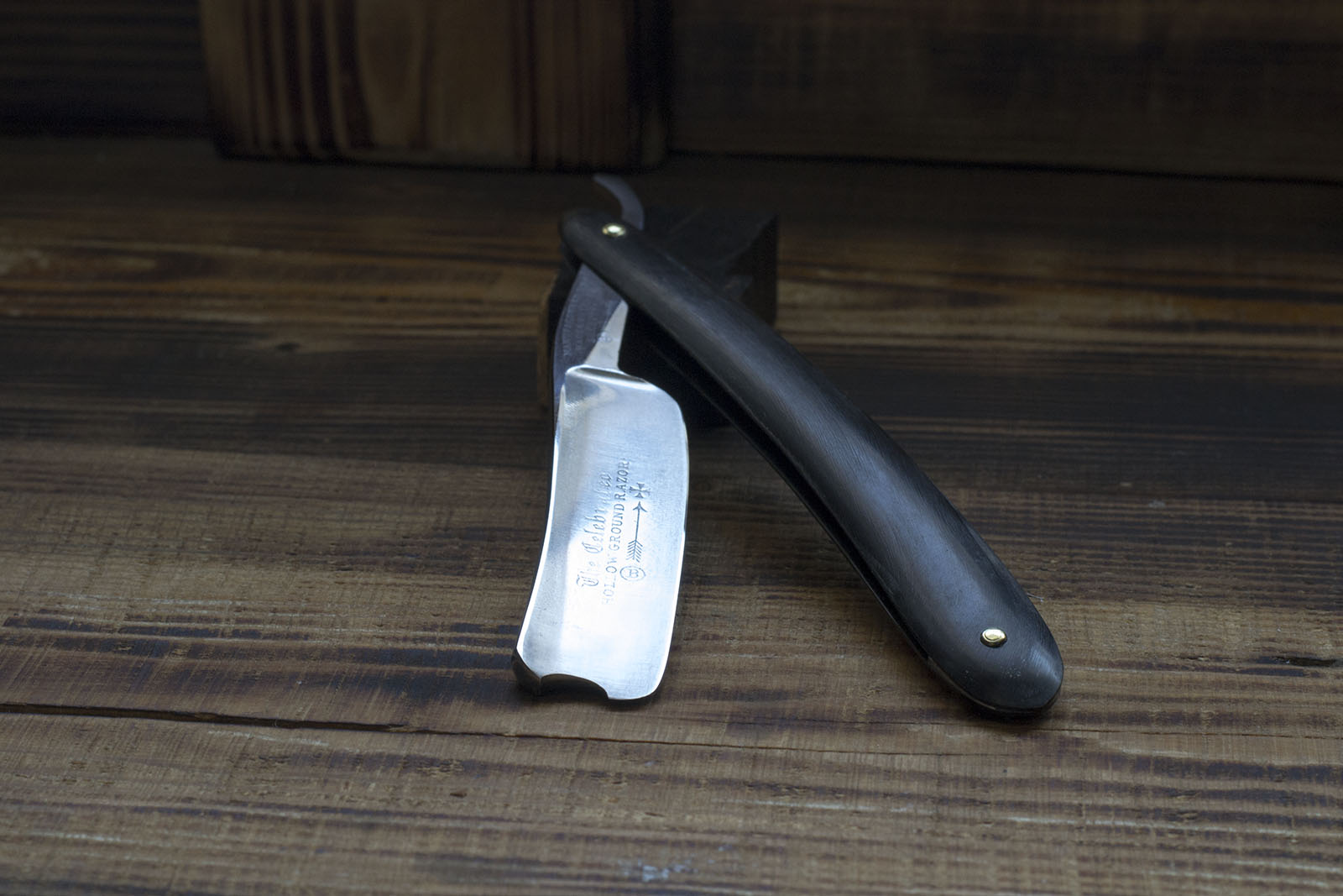 Одна из редких бритв моей коллекции - английский клин от Joseph Wostenholm, торговой марки EBRO. На полотно нанесено травление с символами масонства и поскольку резист перед травлением наносился вручную, каждую такую бритву можно считать отдельным штучным произведением искусства того времени. Бритва произведена середине 19 века, выполнена из качественной углеродистой стали, геометрия полотна на довольно высоком уровне, поэтому было решено оставить бритву в максимально оригинальном состоянии с. Я всего лишь отполировал полотно, немного поработал с травлением и произвел заточку, так же была изготовлена новая рукоять из рога африканского буйвола. Ширина 21 мм., бритва заточена и готова к бритью, отличный коллекционный экземпляр в редкой сохранности. продано EBRO Show