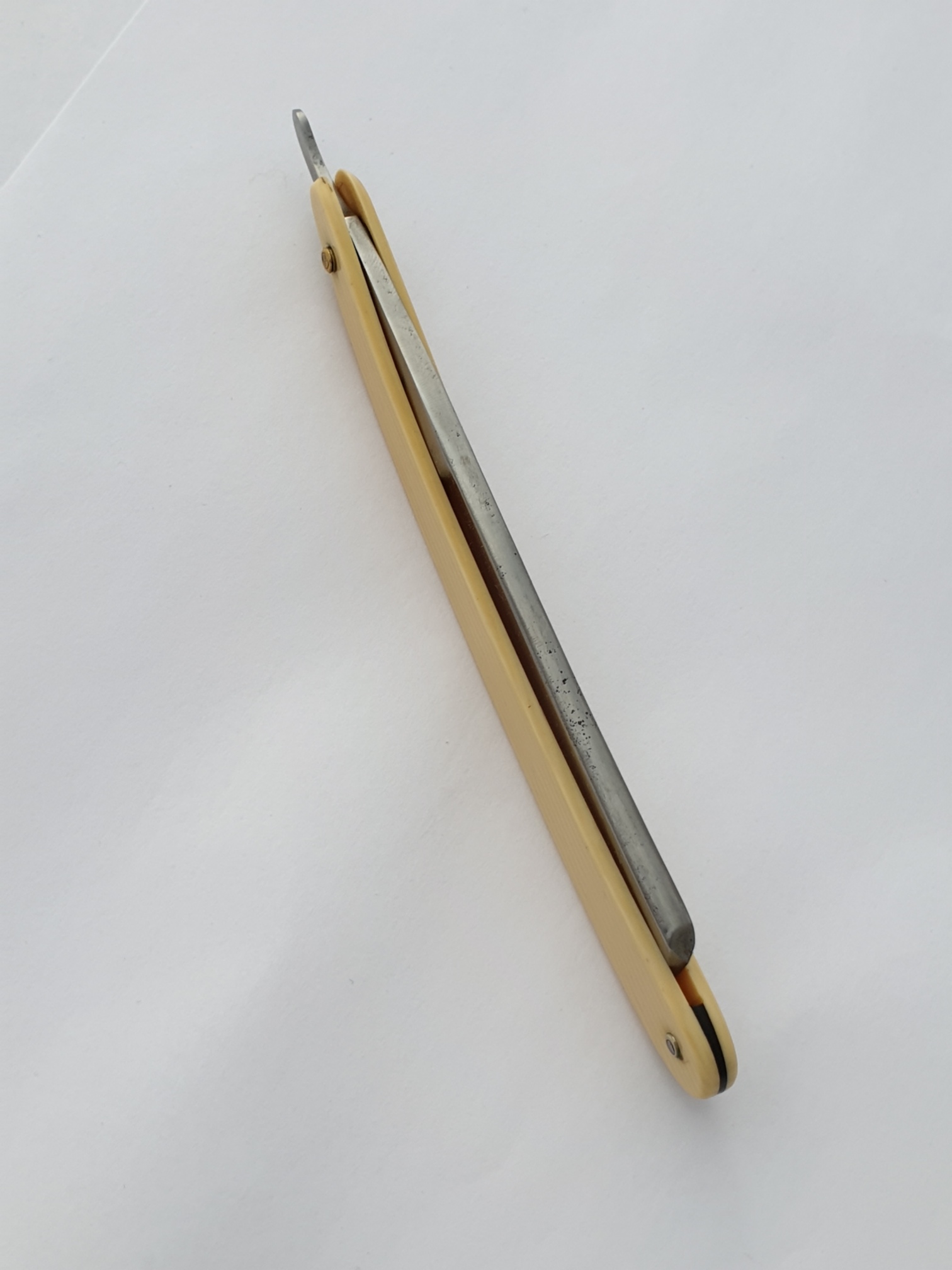 Продаётся от S&T56. Бритва под восстановление, продается как есть. Bengall cast steel, ширина клинка 17мм, обух 4мм, длина рабочей кромки 70мм. Ручка вероятно не родная, целлулоид, ровная, без дефектов.
