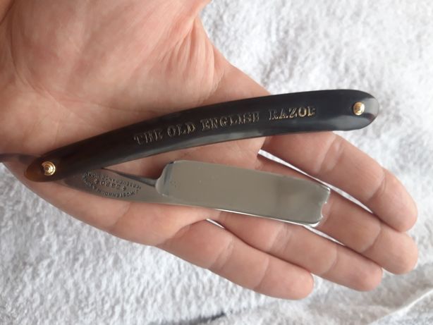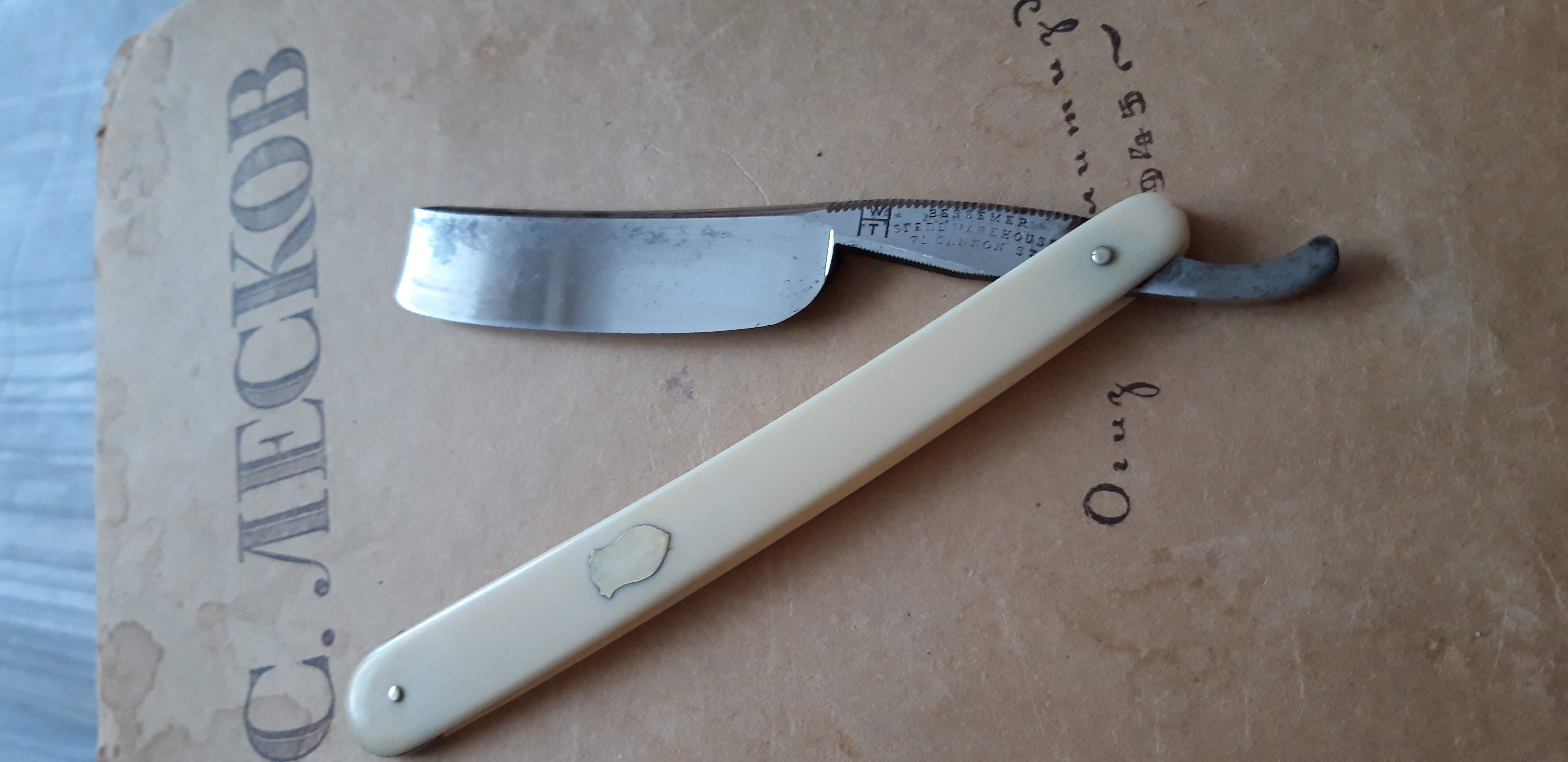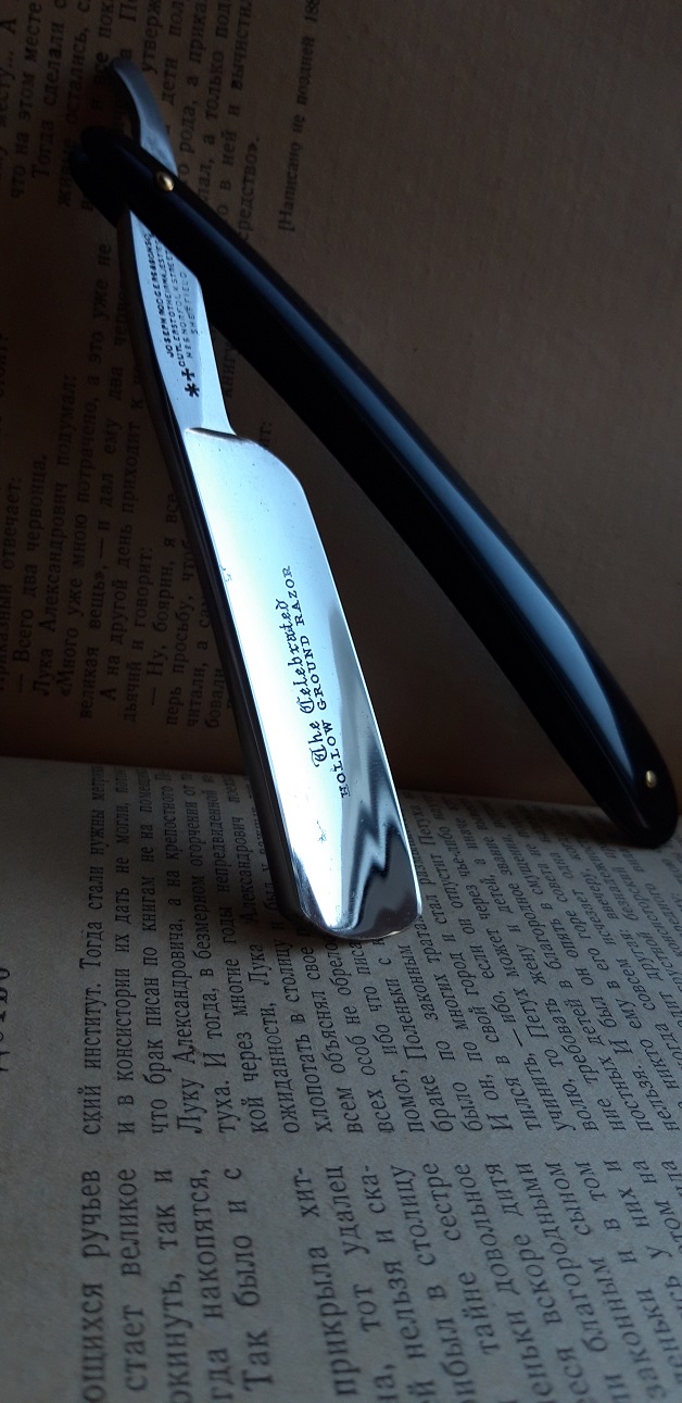 Красивая, Улыбчатая бритва. Имеется патина и небольшие продольные царапины (Не Я). Ручка слон. Клинышек - олово. Бритва имеет заводской гринд и блеск. Камней не видела. Геометрия на высшем уровне! Достойный экспонат. Не заточена. Фраза "Под восстановление", почему-то, язык не поворачивается сказать. Продана.