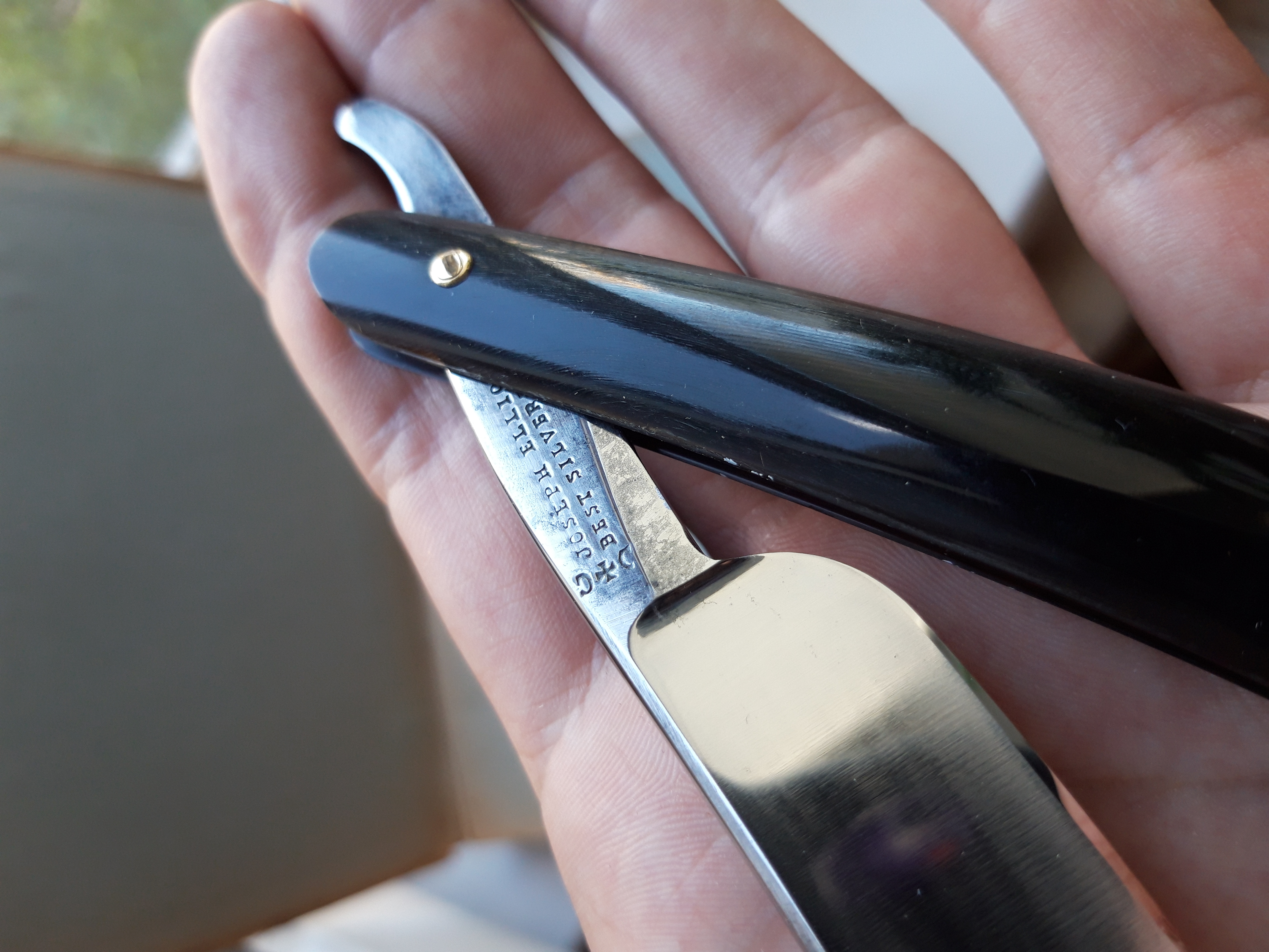 Клин. 20 мм. Обух более 6мм. Увесистый экз. Нос - танкерный. Ручка рог родная, мощная, в идеале. Клинышек олово. Бритва в использовании не была. Единственное, немного времени осталось возле обуха. Абсолютно ничего страшного. Бритва прошла через хорошие руки Дядюшки Фантомаса. Заточка тоже его. За что ему огромная благодарность! Продана.