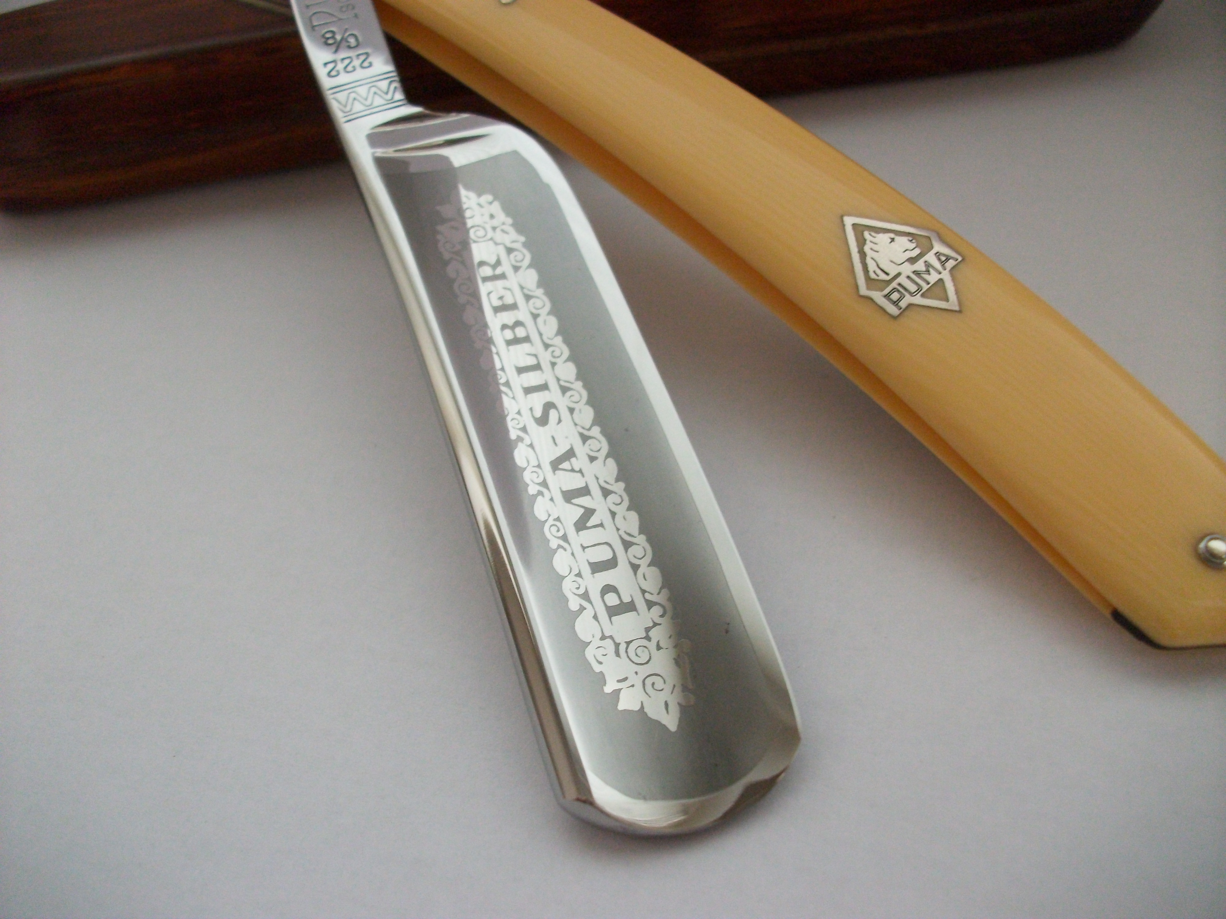 Хорошая бритва от легендарной фабрики Puma-Werk. Углеродистая сталь (на эрле указано Puma steel к сожалению не могу сказать какие особенности она в себе несет), ширина полотна 21мм, длинна режущей кромки 73мм, форма полотна имеет еле заметную улыбку, ручка - целлулоид. В комплекте фирменный футляр. Продано Spoiler Show