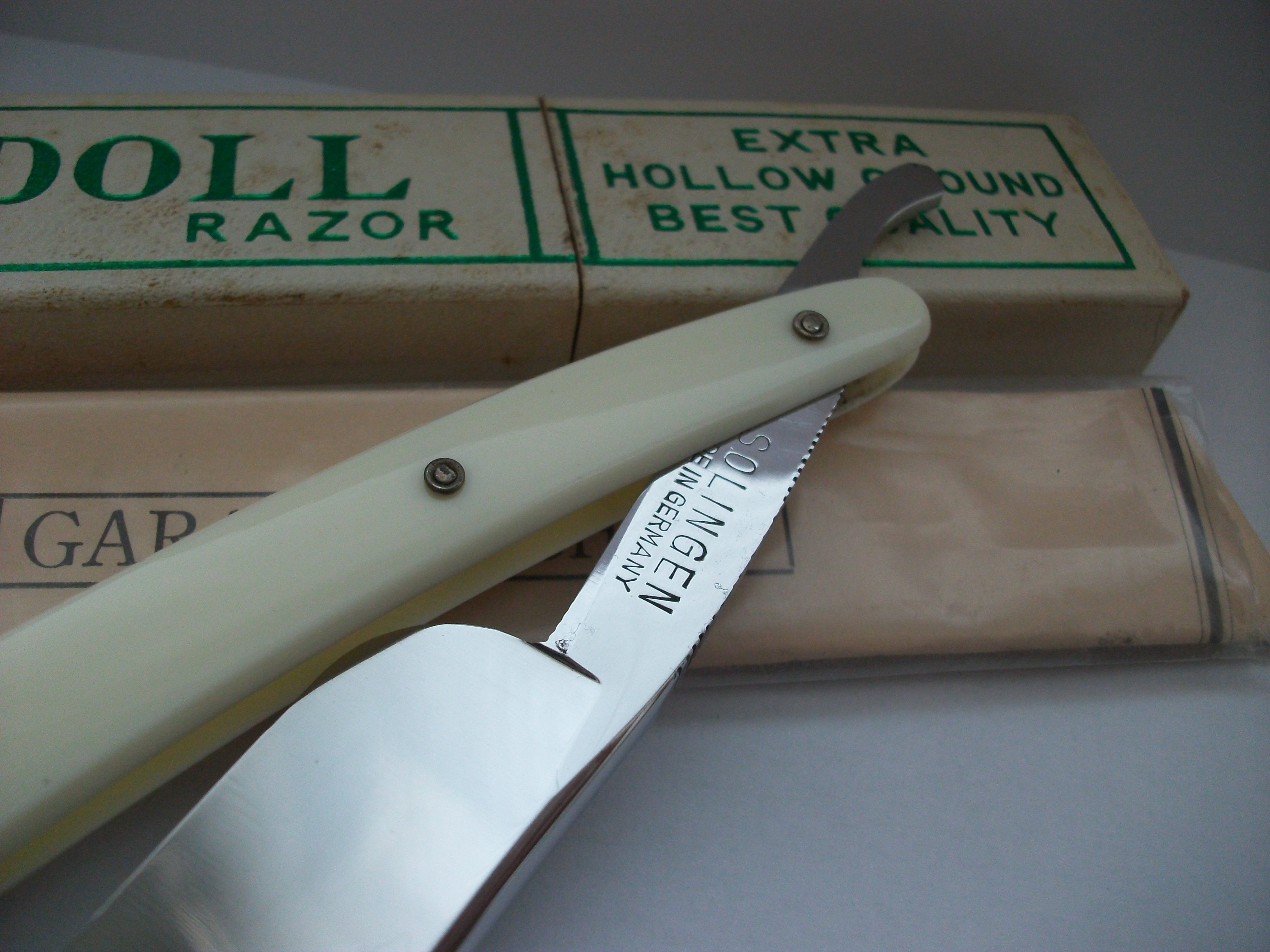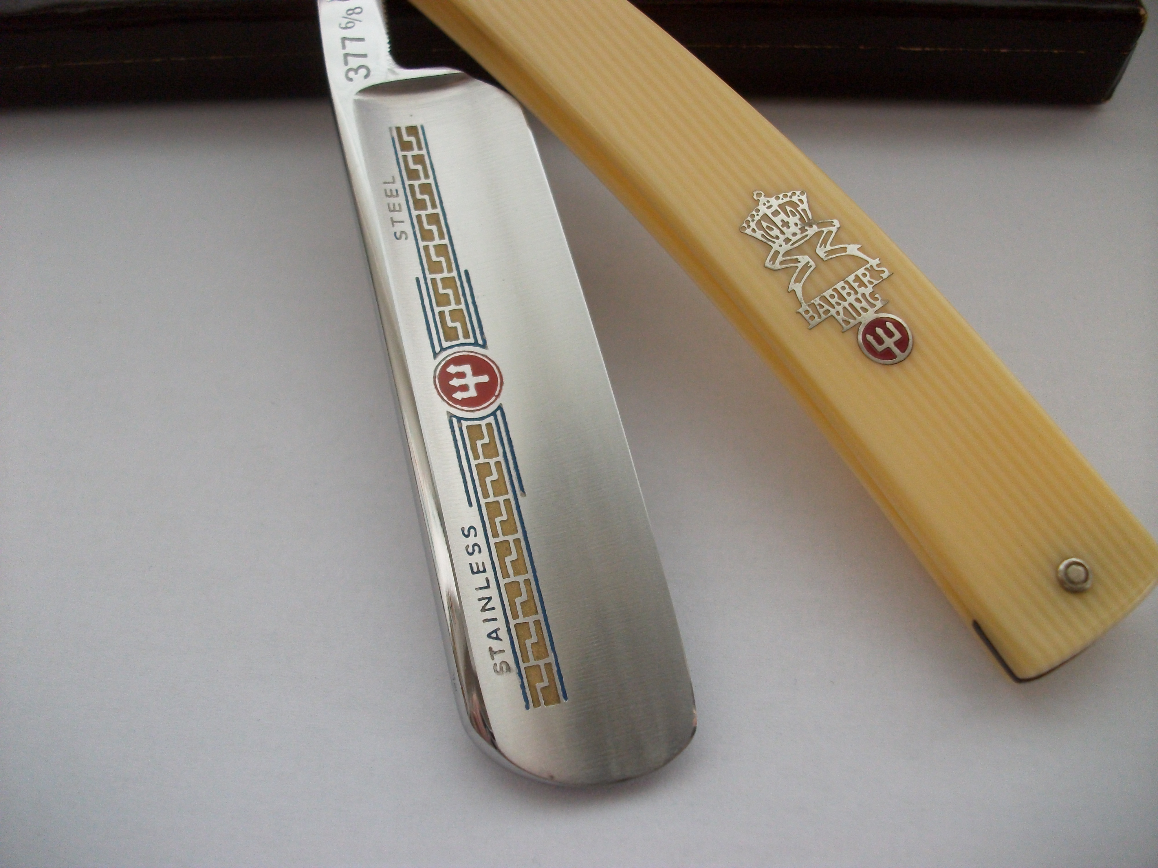 Экземпляр сочетающий такие несовместимые определения как Китай, качество, винтаж... Бритва имеет хорошую геометрию, углеродистая сталь, ширина полотна почти 21мм, длина режущей кромки 68мм, ручка пластик. Примерно 50-70 года ИМХО. Заточена и готова к бритью. Продано Spoiler Show