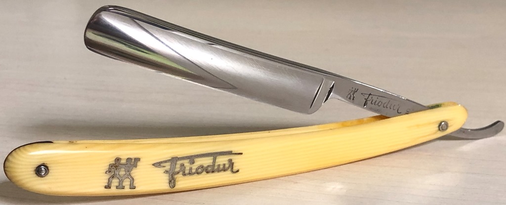 Все 4 бритвы разных моделей, в состоянии идеальное или близкое к идеальному... Непользованный J.A.HENCKELS.SOLINGEN ZWILLINGSWERK модель 72 Ширина полотна-20 мм Толщина обушка-5.8 мм Полная вогнутость. Сталь условно нержавеющая-FRIODUR INOX Бритва не разбиралась и не ремонтировалась, не имеет следов пользования.Заводская шлифовка и полировка. Полотно без царапин, следов окисления и других дефектов.(немного сошла синяя краска с букв на полотне, но это не принципиально).Идеальная геометрия клинка:кромочка равномерна по всей длине и еле заметна.Заточена и готова к бритью. Цена-9500 р с доставкой. ПРОДАН Spoiler Show