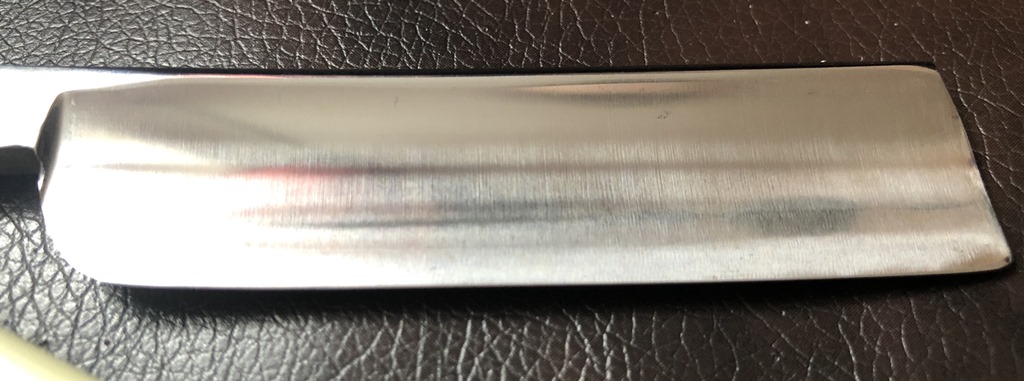 (Один из трех вариантов написания иероглифа 剣/劒/剱, Кэн( Цуруги), "меч". Спасибо уважаемому Игорю Ашмарину, ака INSUI , за перевод,) Ширина полотна-21.5 мм Толщина обушка-6.5 мм Углеродистая высококачественная сталь. Полная вогнутость. Бритва в прекрасном состоянии, без следов пользования. Пришлось разобрать бритву и перебрать осевой пин, с сохранением оригинальных частей.Красивая бритва, по японски аскетичная, но с отличной,"звенящей" сталью. Идеальная геометрия полотна:кромочка равномерна по всей длине и еле заметна. Сталь и кромка чистые, без видимых дефектов.За счет толстого обушка,бритва достаточно тяжёлая.Сталь средней твердости.После заточки бритва лично была протестирована. Бритьё мягкое и чистое, без нареканий.После бритья недельной щетины кромка легко проходила тест на рез волоса, без правки на ремне. Пластиковая коробочка в цвет оправы бритвы. Цена 10500 р с доставкой. ПРОДАН Spoiler Show
