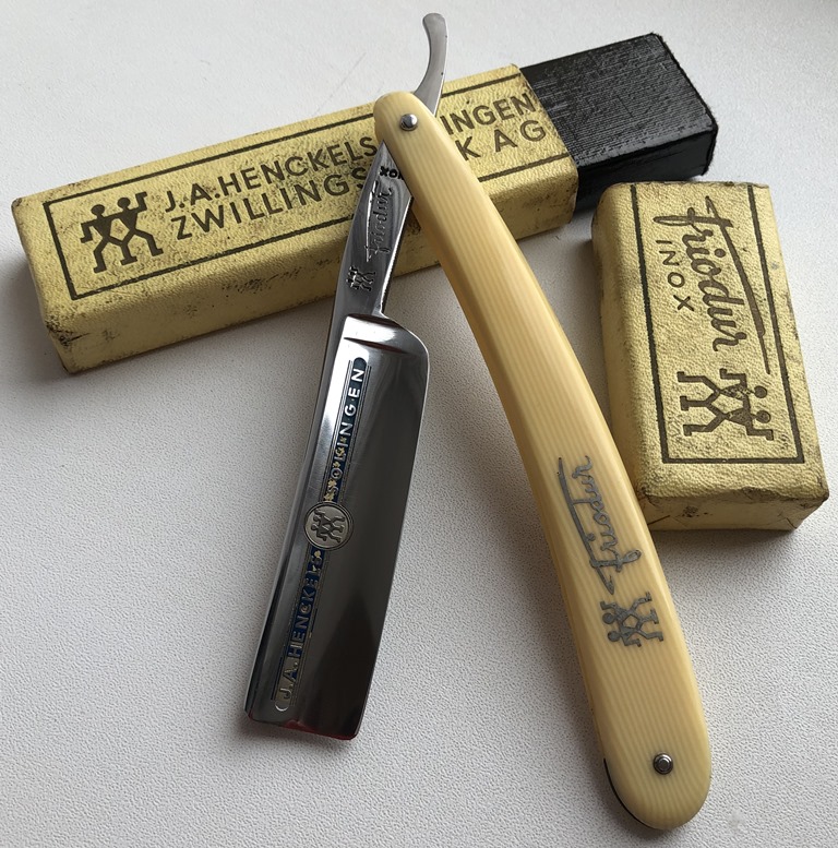 Все 4 бритвы разных моделей, в состоянии идеальное или близкое к идеальному... Непользованный J.A.HENCKELS.SOLINGEN ZWILLINGSWERK модель 72 Ширина полотна-20 мм Толщина обушка-5.8 мм Полная вогнутость. Сталь условно нержавеющая-FRIODUR INOX Бритва не разбиралась и не ремонтировалась, не имеет следов пользования.Заводская шлифовка и полировка. Полотно без царапин, следов окисления и других дефектов.(немного сошла синяя краска с букв на полотне, но это не принципиально).Идеальная геометрия клинка:кромочка равномерна по всей длине и еле заметна.Заточена и готова к бритью. Цена-9500 р с доставкой. ПРОДАН Spoiler Show