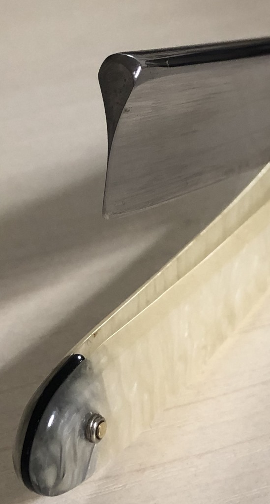 Бритва в прекрасном состоянии, без видимых следов пользования. Разобрал, немного прошёлся самыми тонкими абразивами и снова собрал, заменив пины на немецкие двух-цветные втулки, с добавлением внутренних шайб. Родная оправа также в отличном состоянии. Идеальная геометрия:кромочка равномерна по всей длине и еле заметна. Отличный, достаточно редкий экземпляр, в таком сохране. Не пропустите очень хорошую и недорогую вещь.