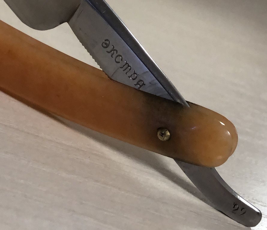 Бритва в прекрасном состоянии, без видимых следов пользования. Разобрал, немного прошёлся самыми тонкими абразивами и снова собрал, заменив пины на немецкие двух-цветные втулки, с добавлением внутренних шайб. Родная оправа также в отличном состоянии. Идеальная геометрия:кромочка равномерна по всей длине и еле заметна. Отличный, достаточно редкий экземпляр, в таком сохране. Не пропустите очень хорошую и недорогую вещь.