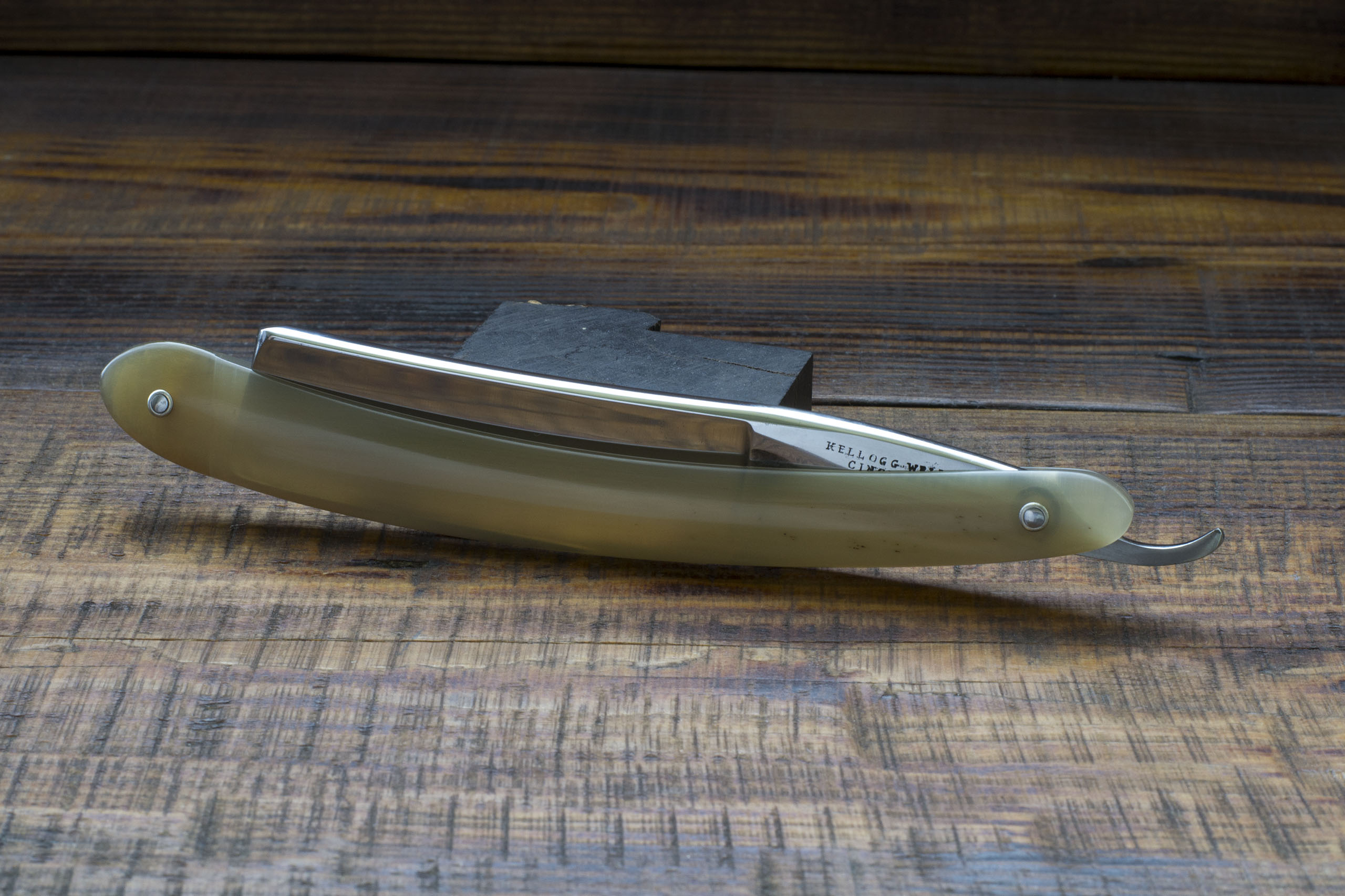 Старинная бритва с вогнутостью 3/4, произведенная на фабрике в Шеффилде, Англия, специально для компании Kellogg, Wells & Co. Интересно, что предприятие засветилось в рекламном справочнике города Цинциннати аж в 1838 году и судя по всему, это не было производство, а всего лишь магазин, торгующий хозяйственными товарами, отсюда легко сделать вывод, что бритва была произведена где то на стороннем предприятии, а суда по форме и качеству полотна, предприятие это располагалось в Шеффилде. Бритва имеет ширину 22 мм (7/8), полотно вогнутое, порядка 3/4, массивный широкий эрль, новая рукоять из светлого рога буйвола, изготовлена в классической технике. Сталь - традиционная шеффилдская углеродка, зарекомендовавшая себя как одна из лучших сталей для бритв. Геометрия безупречна, а износ полотна судя по всему - минимальный, мелкие следы окисления, которые я не счел нужным удалять до конца. Отличный и редкий коллекционный экземпляр. Бритва заточена и готова к бритью. Продано Wells Show
