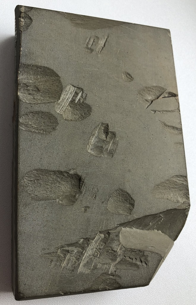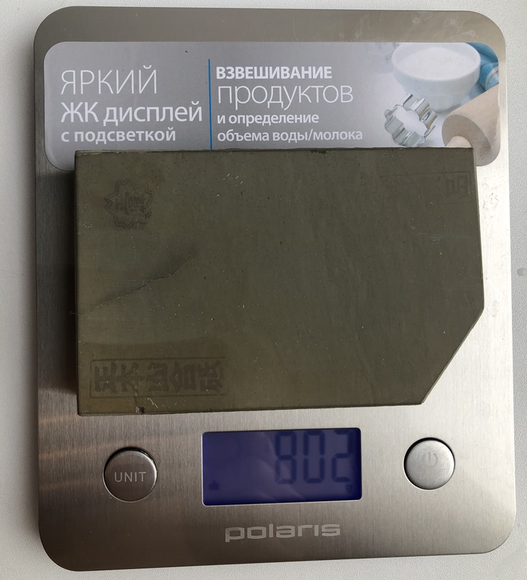 Камень отборный и представляет собой прекрасный экземпляр для финишной тонкой доводки бритв и супер финиша ножей.Поверхность камня однородная, без паразитных включений.( небольшую природную микротрещинку всерьёз не беру, так как она никоим образом себя не проявляет и на сам процесс не повлияет).Оригинальный торцевой распил, задняя часть имеет следы от инструмента по добыче камня(на знаю, как называется).Серо-зелёный оттенок, при намокании становится выражено темно-зелёным, с проявлением рисунка на поверхности, в виде линий и разводов.