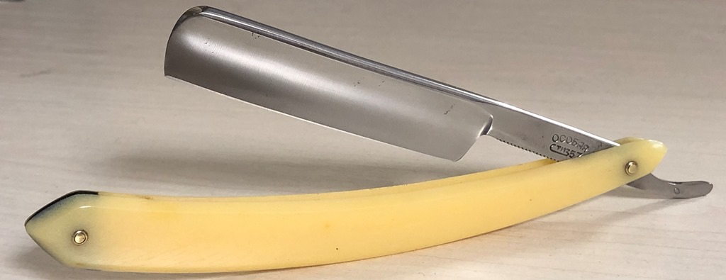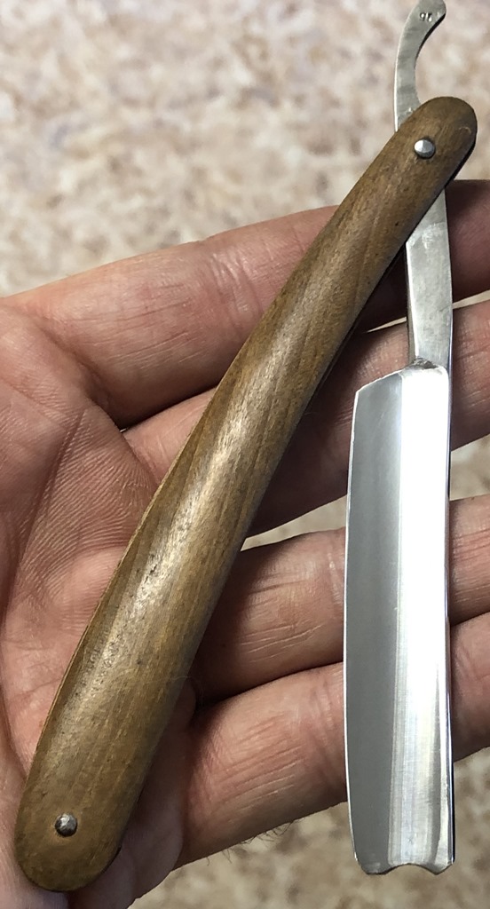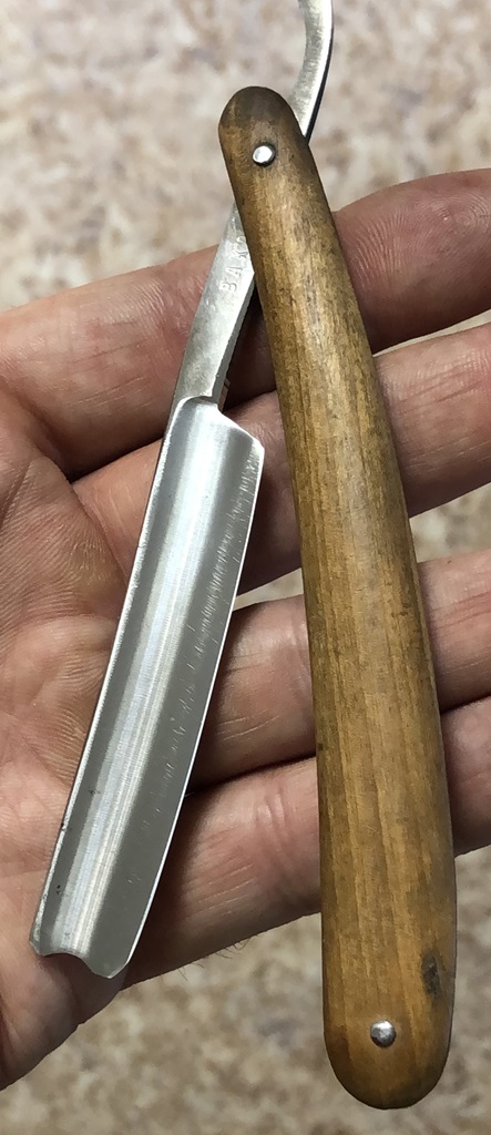 Ширина полотна-16.5 мм Толщина обушка-4.2 мм Полная вогнутость. Углеродистая сталь. Бритва, приблизительно 1936 года выпуска. В весьма хорошем состоянии. Разобрал, почистил клинок и снова собрал, поменяв родные медные пины на немецкие втулки, с добавлением внутренних шайб.Оригинальная буковая ручка находится в исключительном состоянии, без каких либо дефектов.Сталь полотна чистая, геометрия идеальная. Кромочка еле заметна и равномерна по всей длине. Родная, редкая коробочка также в комплекте:плотный , без дефектов картон.Бритва заточена и готова к бритью. Цена-3800 р с доставкой. ПРОДАН Внимание! Важная информация! Spoiler Show