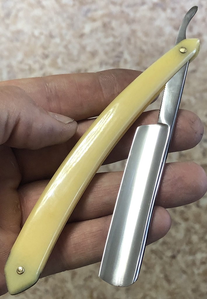 Ширина полотна-17,5 мм Толщина обушка-4,5 мм Полная вогнутость. Углеродистая сталь. Бритва хоть и немного пользованная,но находится в хорошем состоянии.Разобрал, почистил полотно и снова собрал, заменив родной пин на немецкую втулку, с добавлением внутренних шайб.Идеальная геометрия.Бритва заточена и готова к бритью. Цена-3300 р с доставкой ПРОДАН Внимание! Важная информация! Spoiler Show