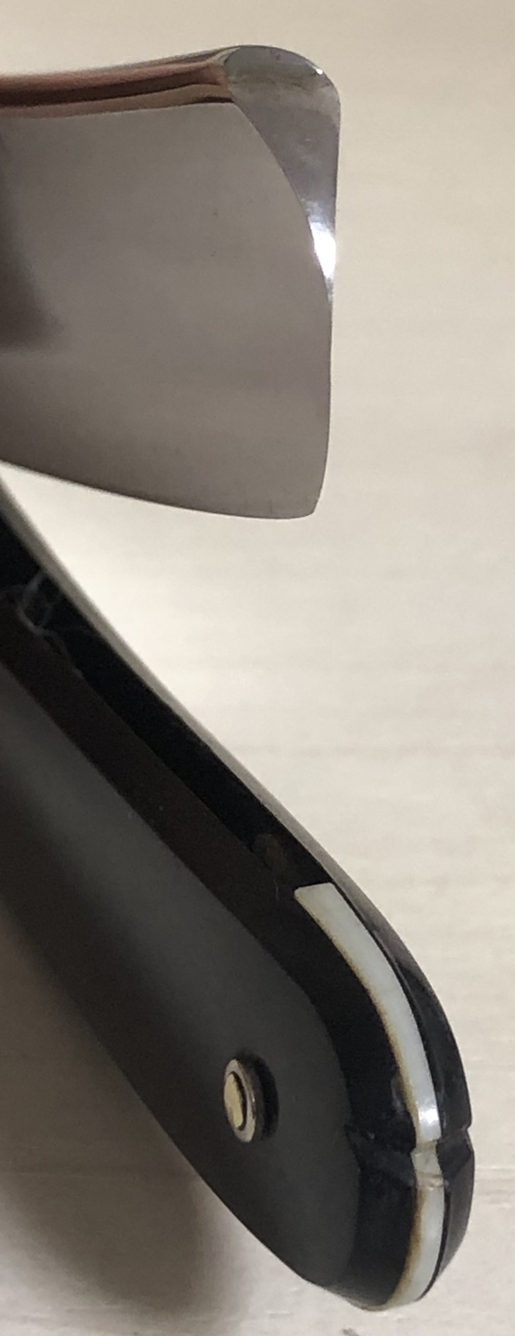 Клинок не имел следов пользования, но прошелся самым тонким абразивом, чтобы убрать патину и царапины и не испортить геометрию полотна. (еле заметное пятнашко времени, что осталось, не в счет).Взамен навсегда утраченной родной ручки я принял нестандартное решение и поставил оправу от английского донора середины 19-го века. Понятно, что японцы никогда не использовали слона на своих изделиях, но тем оригинальнее становится бритва, особенно в наше время.Плашки ручки без трещин, за одним исключением:в районе нижнего пина были просверлены рядом два отверстия(не мной, естественно).Ни на что не влияет, но упомянуть обязан.Думаю, такой косячок можно простить мастерам 19-го века.