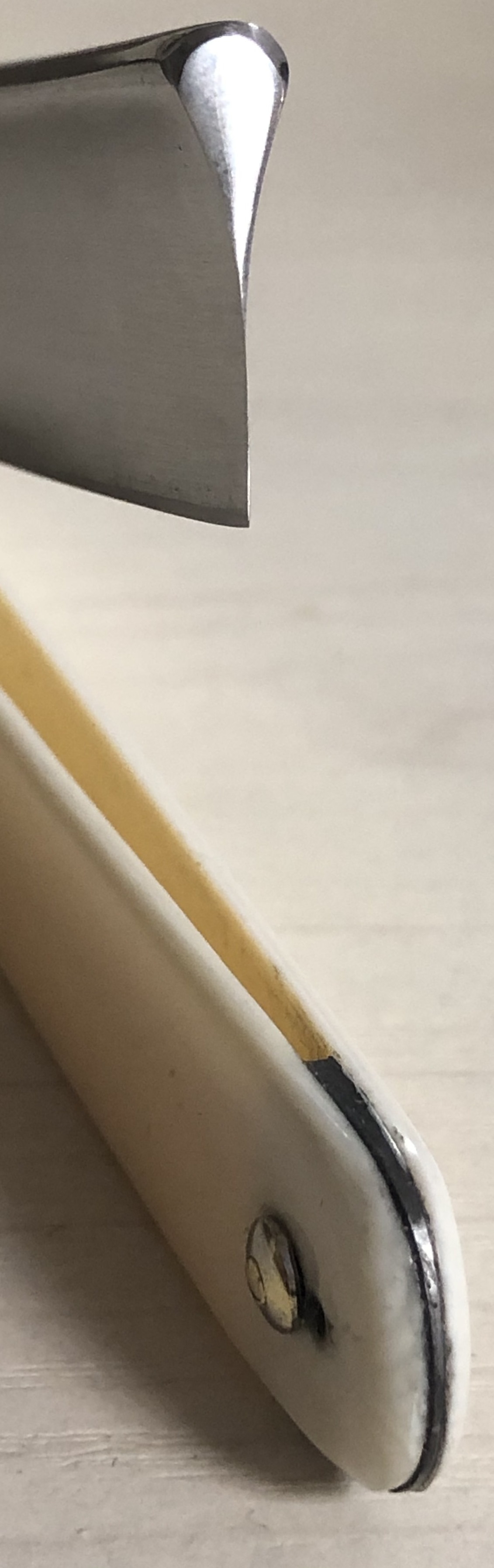 По всей видимости бритва в пользовании не была,судя по отсутствию следов от заточных камней на обушке, но была подвержена неправильной попыткой заточки, о чем говорят штрихи на лицевой стороне полотна.Это место немного полирнул, а обратную сторону клинка перешлифовал и также отполировал. Заменил пины и убрал окисление и патину в районе осевого пина.Сталь чистая, без видимых дефектов.Идеальная геометрия полотна. Заточена и готова к бритью. Коробочка, естественно неродная, зато пролетарского цвета, соответствующая духу того времени.