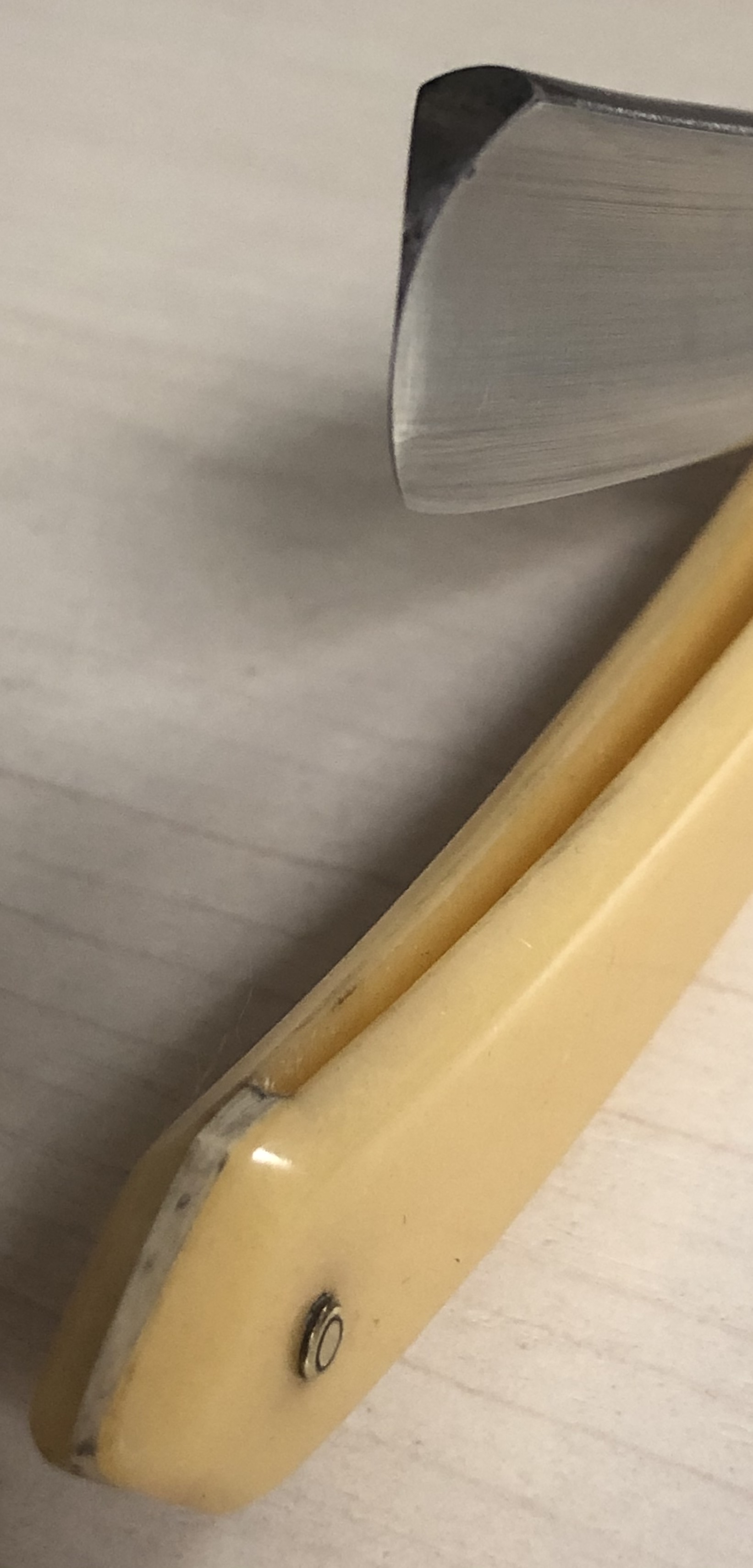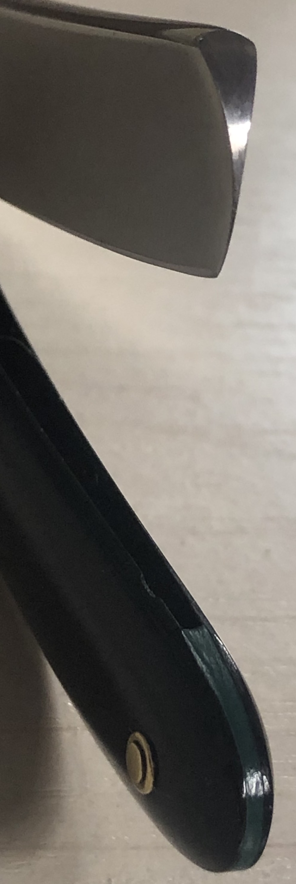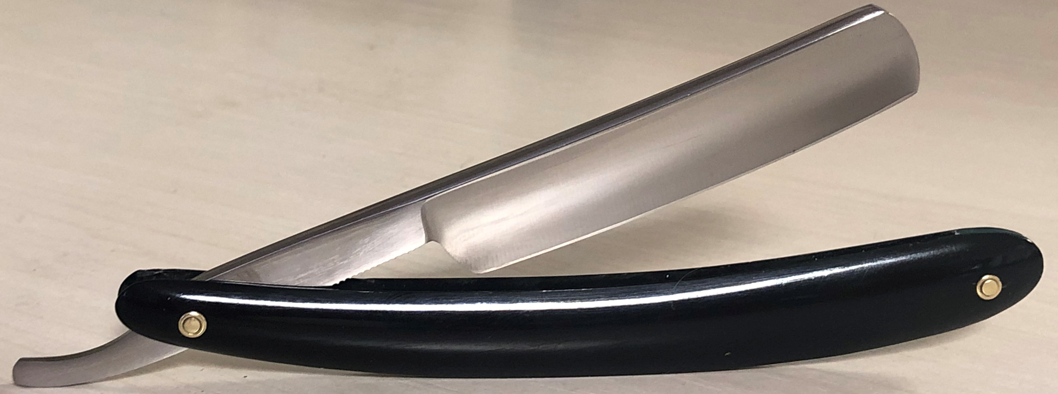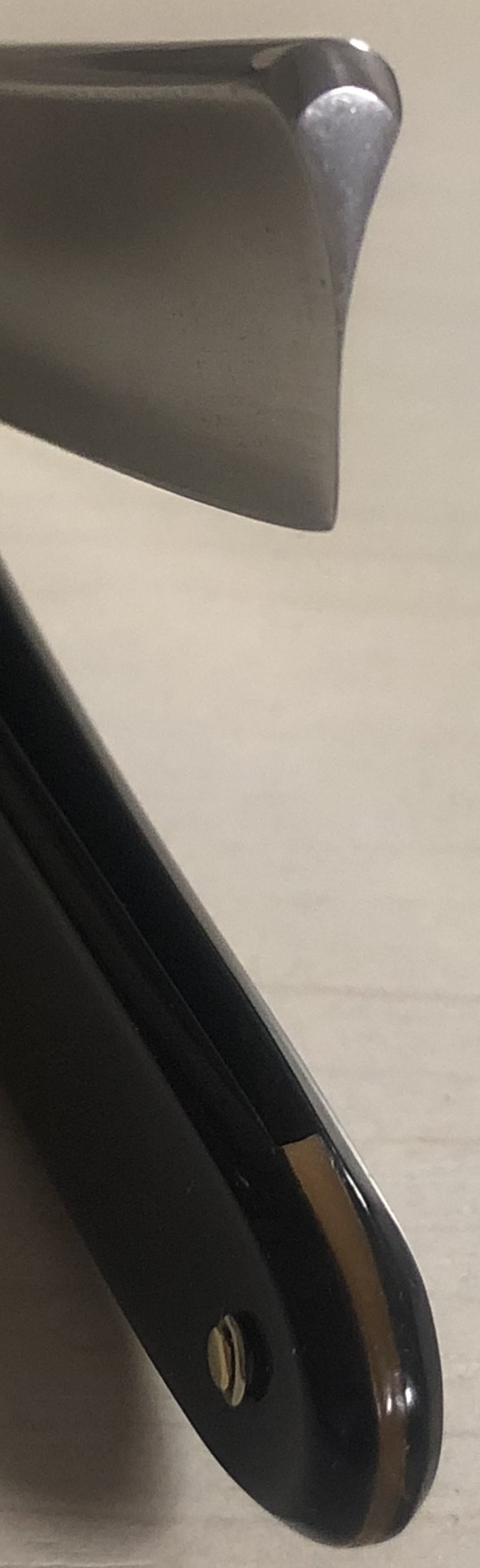 Клинок в очень хорошем состоянии.Немного исправил "обратную улыбку", почистил ,восстановил оригинальный гринд,в меру своих возможностей и отполировал.Касаемо оправы...Роговая, натуральная ручка ,древняя,от французского донора 19-го века.(Немного длинновата, конечно, но в любом случае лучше, чем какой то заводской пластик. ) Так как на оправе имелись довольно большие отверстия под пины, то мною было принято решение поставить именно такие шайбы, возможно крупные,зато надёжные.Сталь чистая, без видимых дефектов. Идеальная геометрия клинка:кромочка равномерна по всей длине.Бритва получилась немного тяжелее, по сравнению с бритвой в оригинальном исполнении.В любом случае,бритва приятна во всех отношениях. Брить должна неплохо. Заточена и готова к бритью.