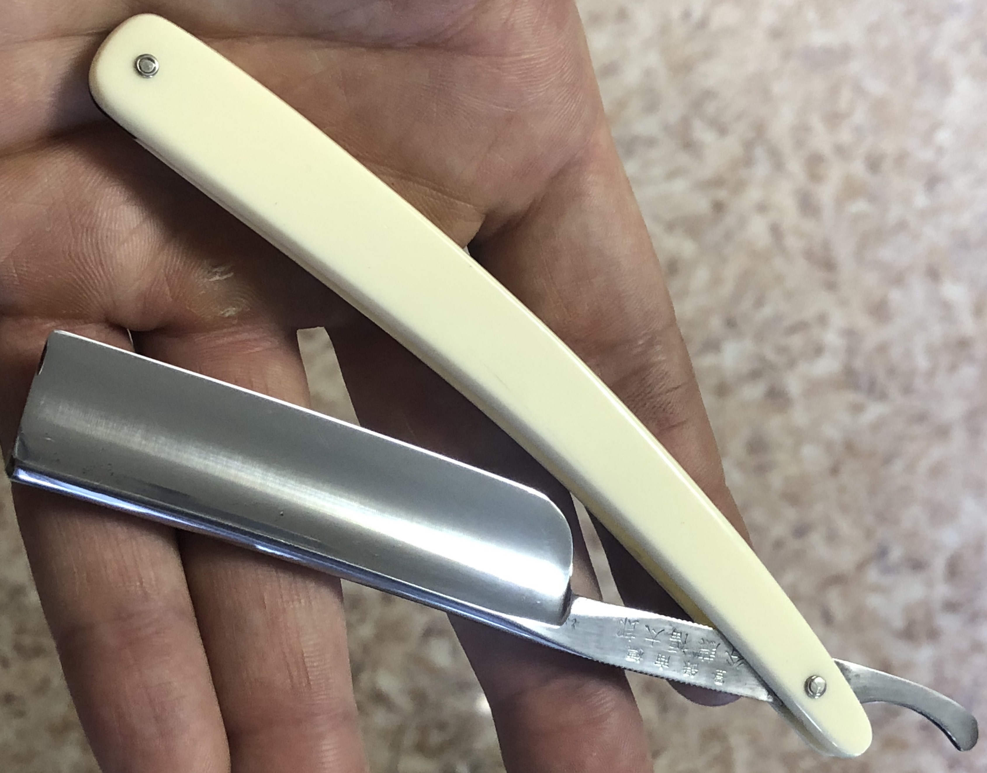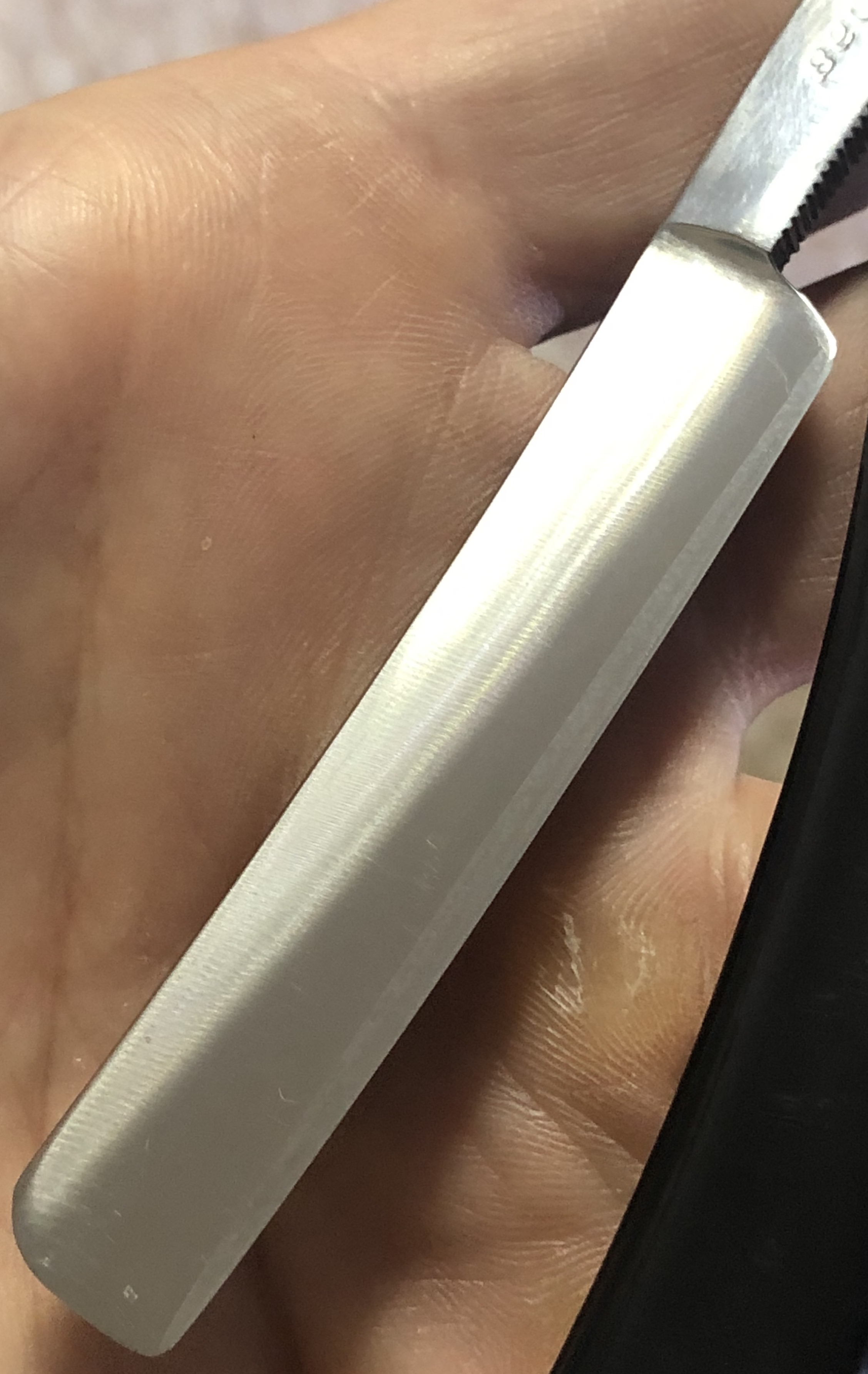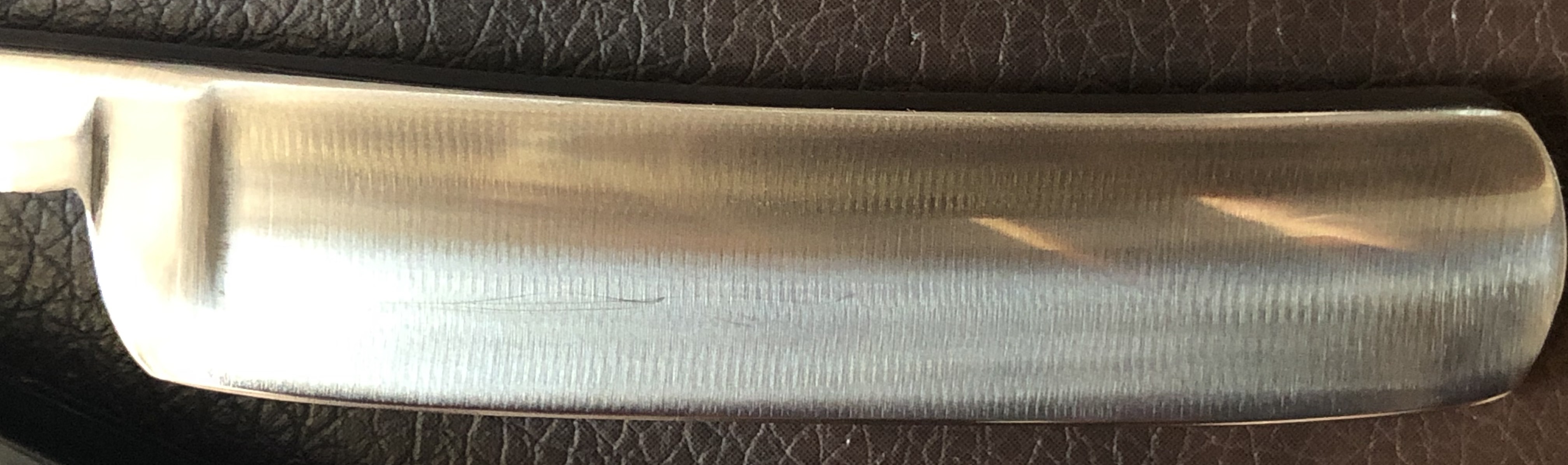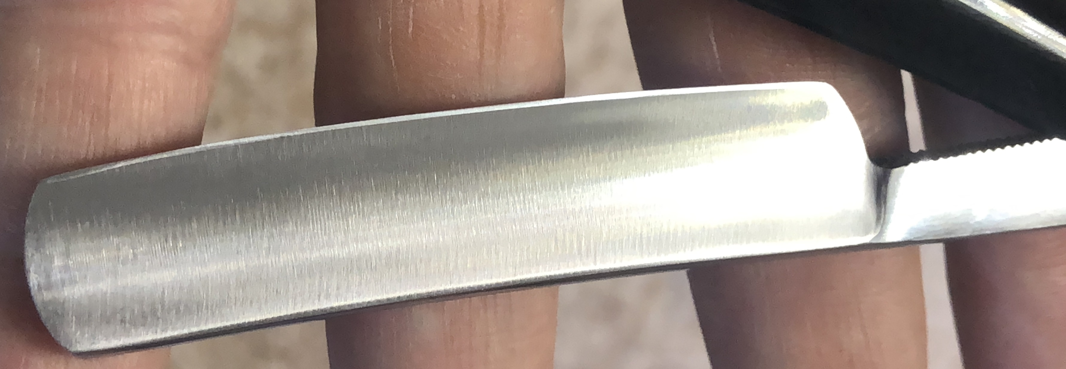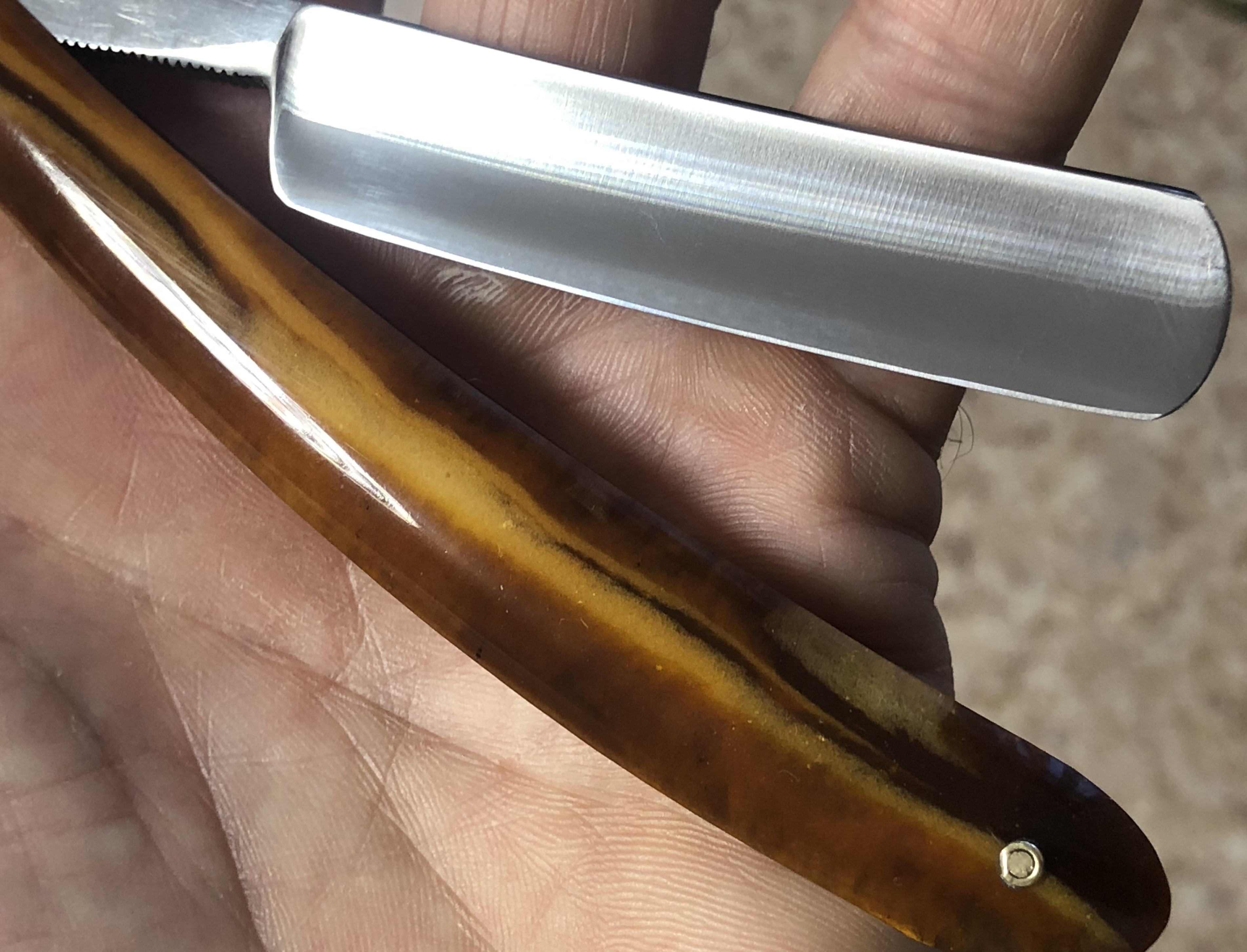 Клинок в очень хорошем состоянии.Немного исправил "обратную улыбку", почистил ,восстановил оригинальный гринд,в меру своих возможностей и отполировал.Касаемо оправы...Роговая, натуральная ручка ,древняя,от французского донора 19-го века.(Немного длинновата, конечно, но в любом случае лучше, чем какой то заводской пластик. ) Так как на оправе имелись довольно большие отверстия под пины, то мною было принято решение поставить именно такие шайбы, возможно крупные,зато надёжные.Сталь чистая, без видимых дефектов. Идеальная геометрия клинка:кромочка равномерна по всей длине.Бритва получилась немного тяжелее, по сравнению с бритвой в оригинальном исполнении.В любом случае,бритва приятна во всех отношениях. Брить должна неплохо. Заточена и готова к бритью.