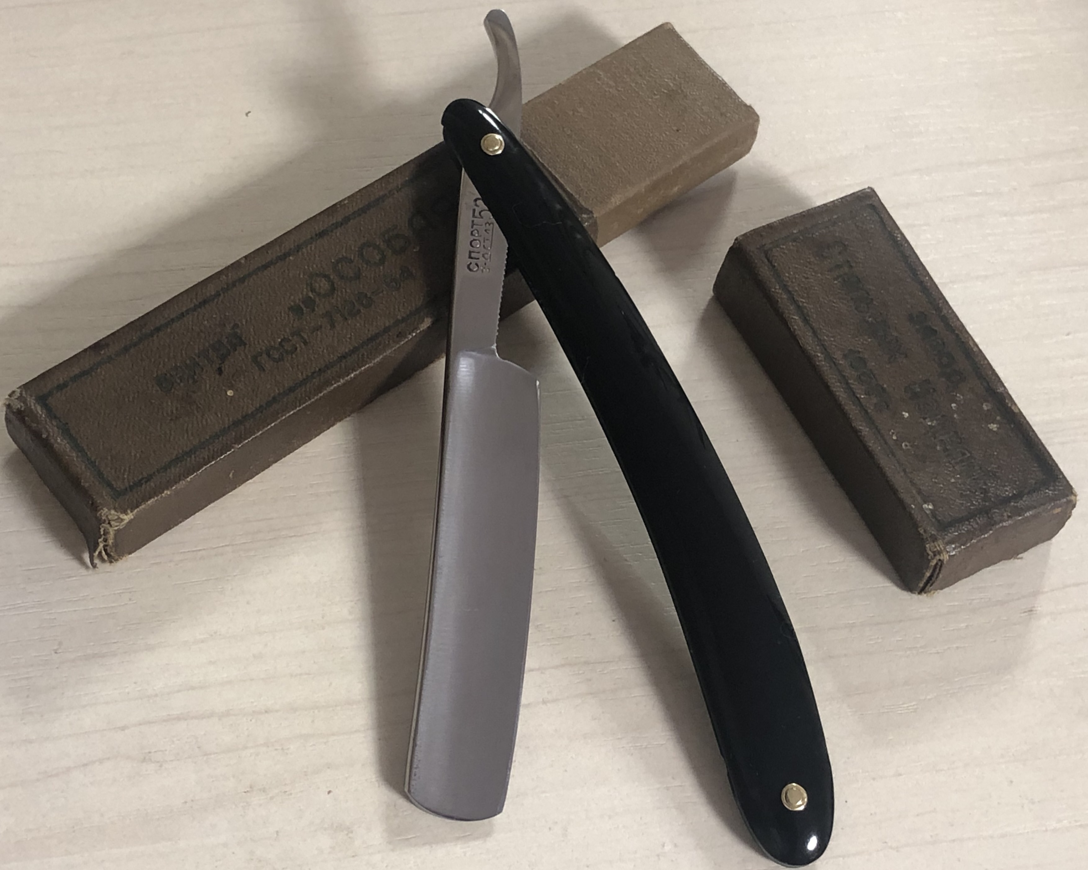 Бритва сталинских лет, в очень хорошем состоянии.Практически непользованная, возможно и вовсе не была в деле.(по крайней мере обушок не имел следов износа).Разобрал, почистил клинок, убрал небольшой скольчик с полотна и снова собрал, добавив внутренние шайбы и заменив пины.Оригинальный гринд полотна также попробовал повторить.Сталь чистая, без видимых и критичных дефектов. Идеальная геометрия:кромочка равномерна по всей длине.Коробочка стизовская тоже, но только от "особой".Заточена и готова к бритью.Относительно недорогой, но очень приятный экземпляр не только для новичка, но и для любого бритвомана.