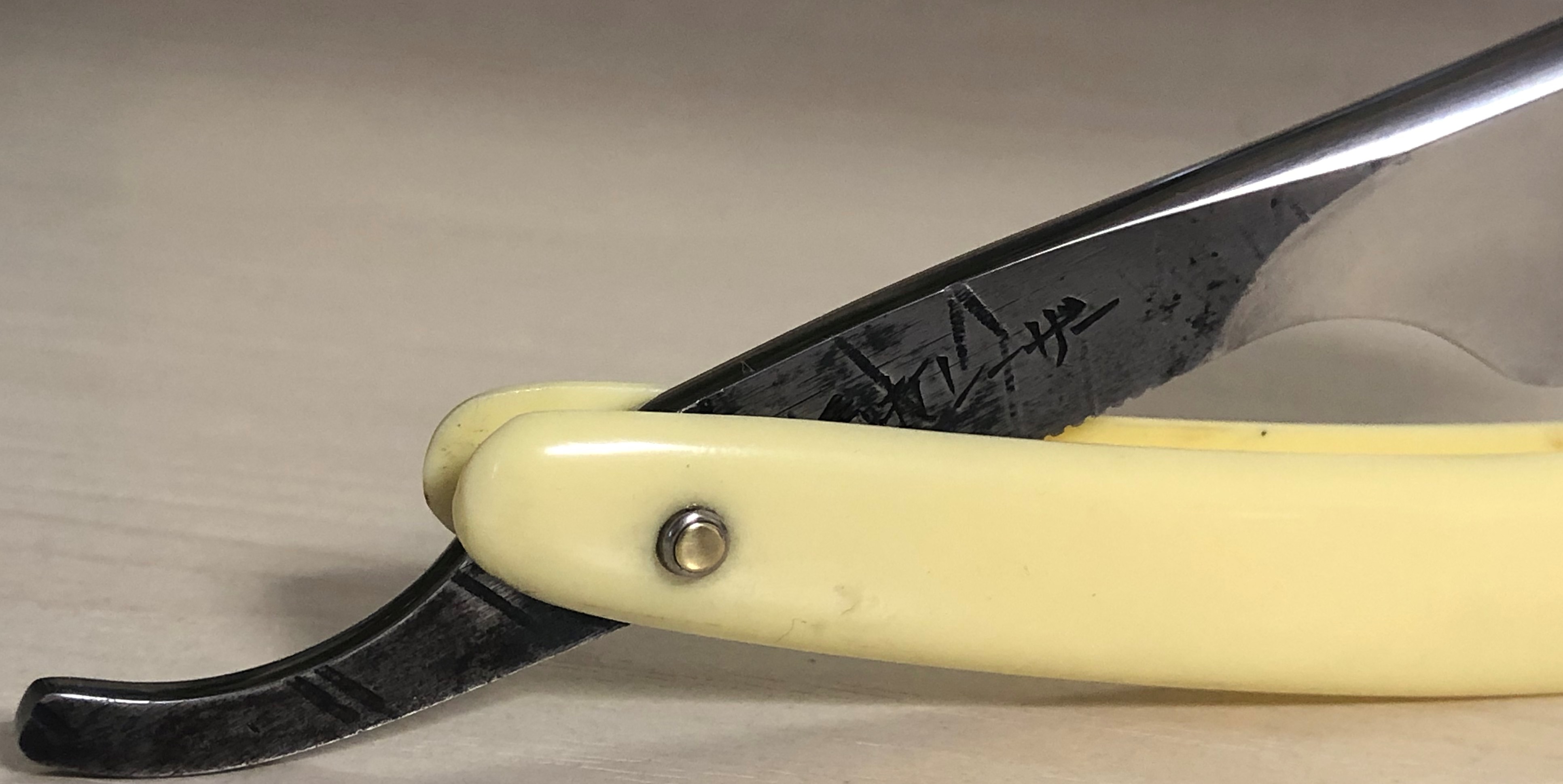 Малопользованная, либо вообще не была в деле.Бритву разобрал, немного почистил и отполировал клинок и снова собрал, сохранив оригинальный пин.