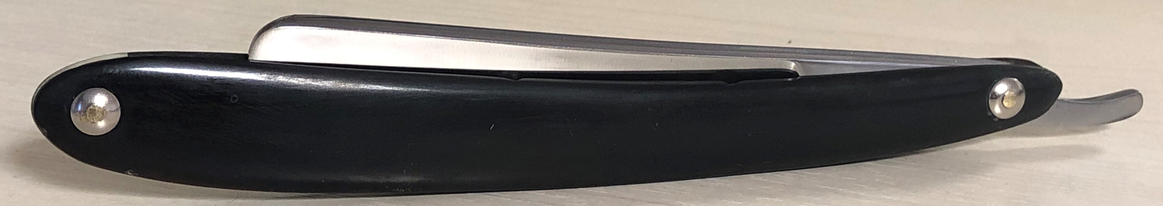 Клинок в очень хорошем состоянии.Немного исправил "обратную улыбку", почистил ,восстановил оригинальный гринд,в меру своих возможностей и отполировал.Касаемо оправы...Роговая, натуральная ручка ,древняя,от французского донора 19-го века.(Немного длинновата, конечно, но в любом случае лучше, чем какой то заводской пластик. ) Так как на оправе имелись довольно большие отверстия под пины, то мною было принято решение поставить именно такие шайбы, возможно крупные,зато надёжные.Сталь чистая, без видимых дефектов. Идеальная геометрия клинка:кромочка равномерна по всей длине.Бритва получилась немного тяжелее, по сравнению с бритвой в оригинальном исполнении.В любом случае,бритва приятна во всех отношениях. Брить должна неплохо. Заточена и готова к бритью.