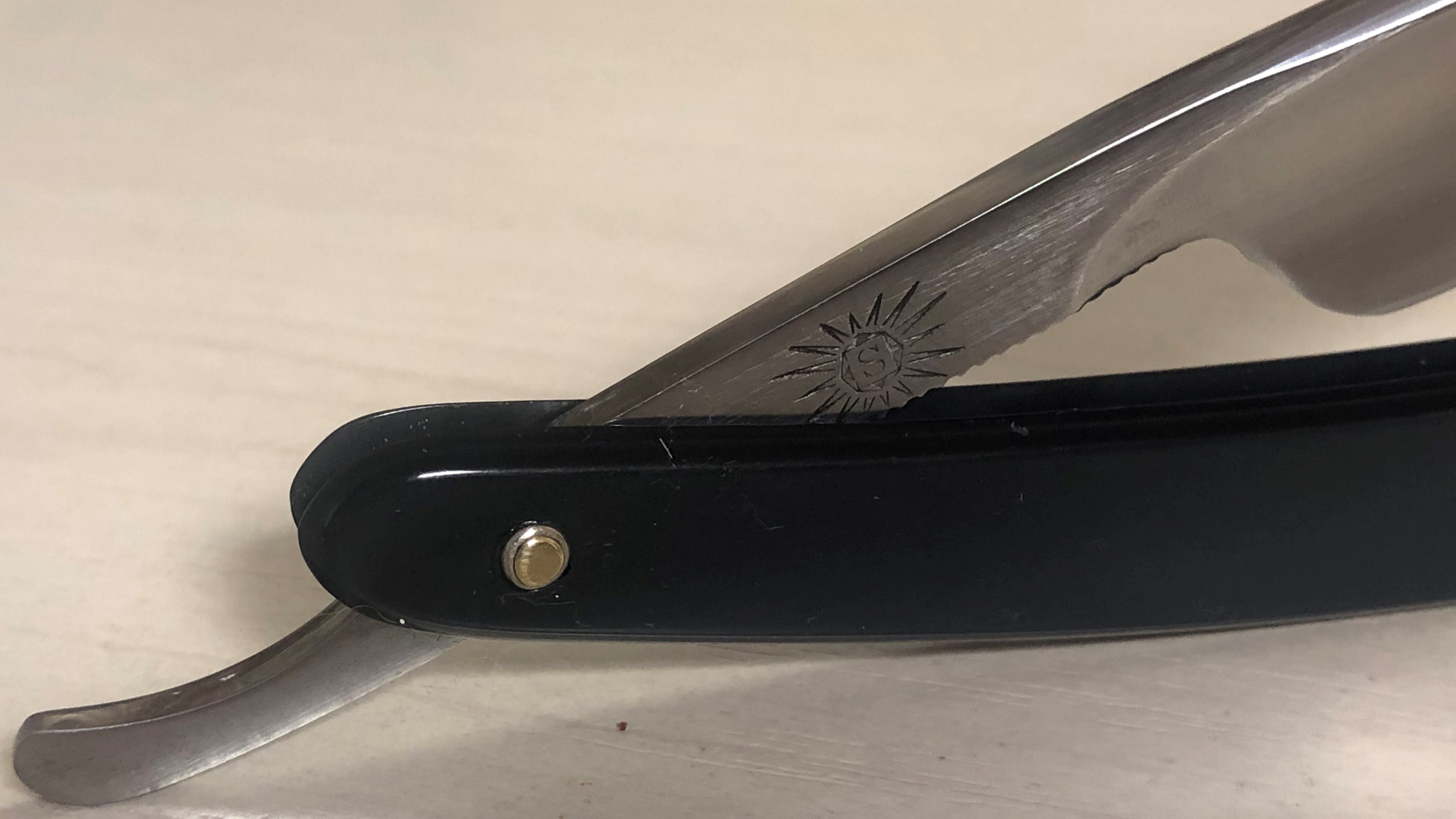 Малопользованная, либо вообще не была в деле.Бритву разобрал, немного почистил и отполировал клинок и снова собрал, сохранив оригинальный пин.