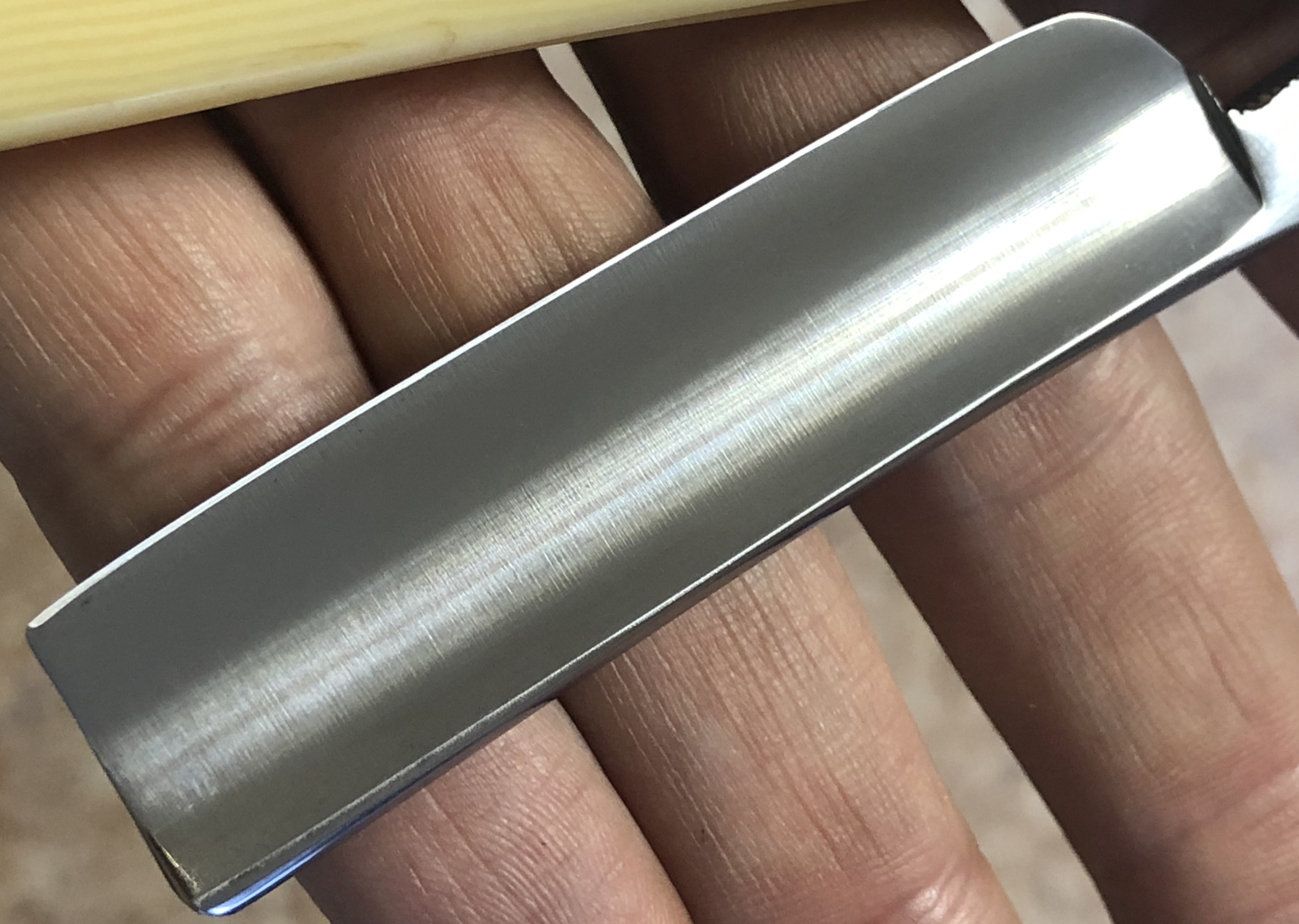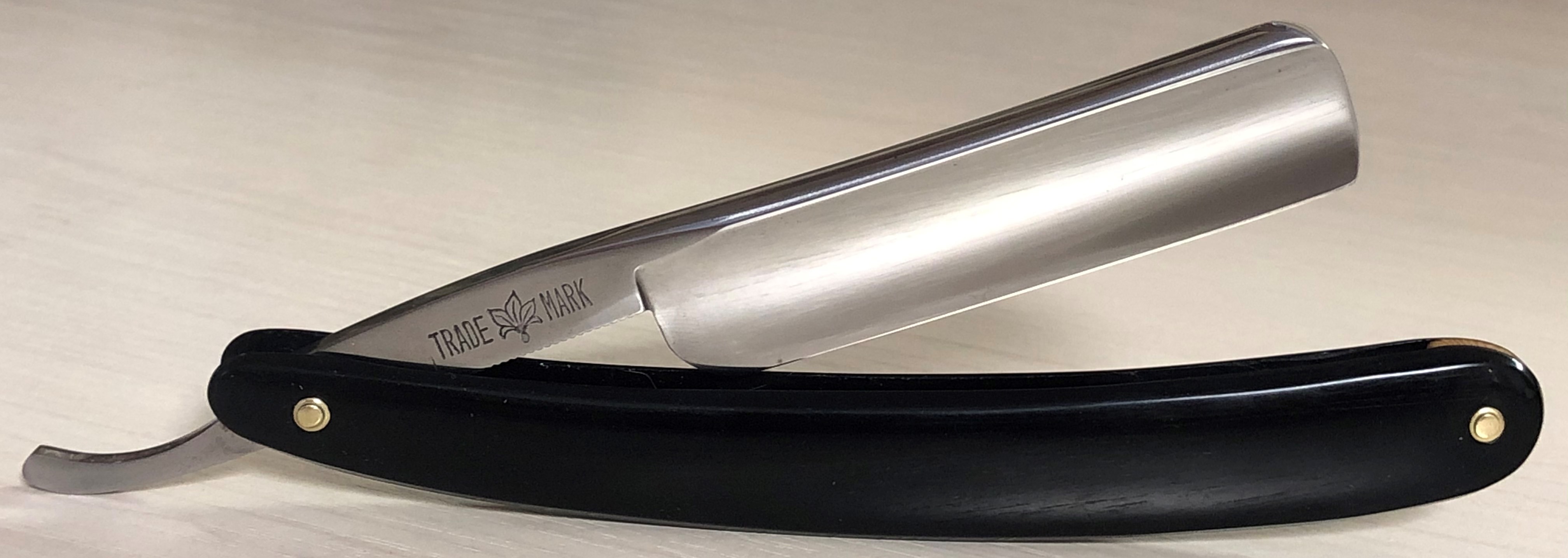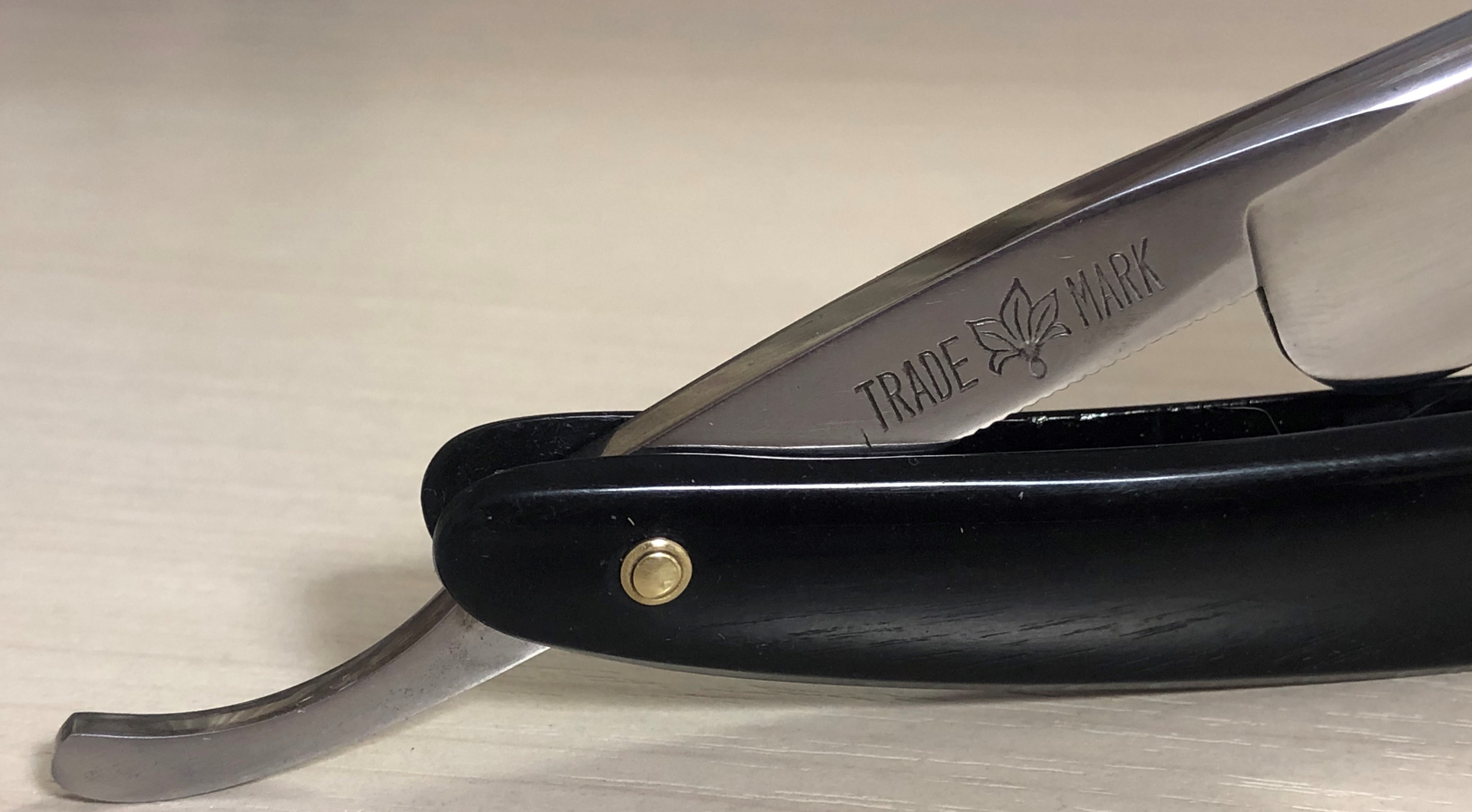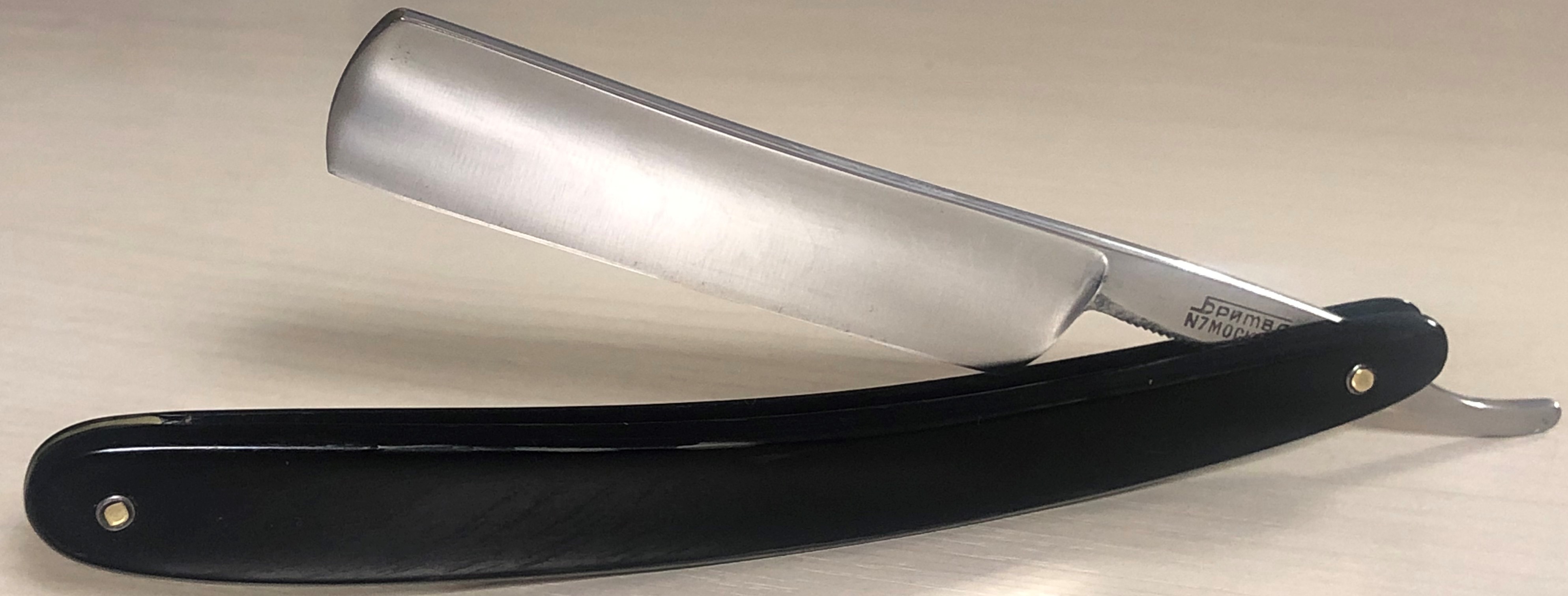 Ширина полотна-20 мм Толщина обушка-6.5 мм Углеродистая сталь. Форма лезвия-1/2 клин Примерно 50-60-е годы . Весьма приятная бритва во всех отношениях. Разобрал,почистил, отполировал и снова собрал, заменив пины на немецкие втулки.Снова не стал идти легким путем и шлифовал клинок на камнях, вручную.Долго, муторно, но получаешь удовольствие от процесса, заодно всегда можно проконтролировать то, что делаешь , чтобы не убрать лишнего и не перегреть с дуру металл..Ясное дело, что задачи не стояло получить идеальное зеркало, как это можно увидеть на множестве новодельных бритв:заплывшее от полироли зеркало. Тут скорее умеренный, легкий продольный сатин, хотя под другим углом ,если смотреть, то отражение очень хорошее.Приятный голубоватый оттенок от ручной шлифовки и полировки. Короче, достаточно красивая, практичная, удобная и недорогая бритва. Сталь не имеет визуальных дефектов, геометрия на уровне.Не пропустите рабочий инструмент за вменяемые деньги. Заточена и готова к бритью. Цена-6500 р с доставкой.ПРОДАН Внимание! Важная информация! Spoiler Show