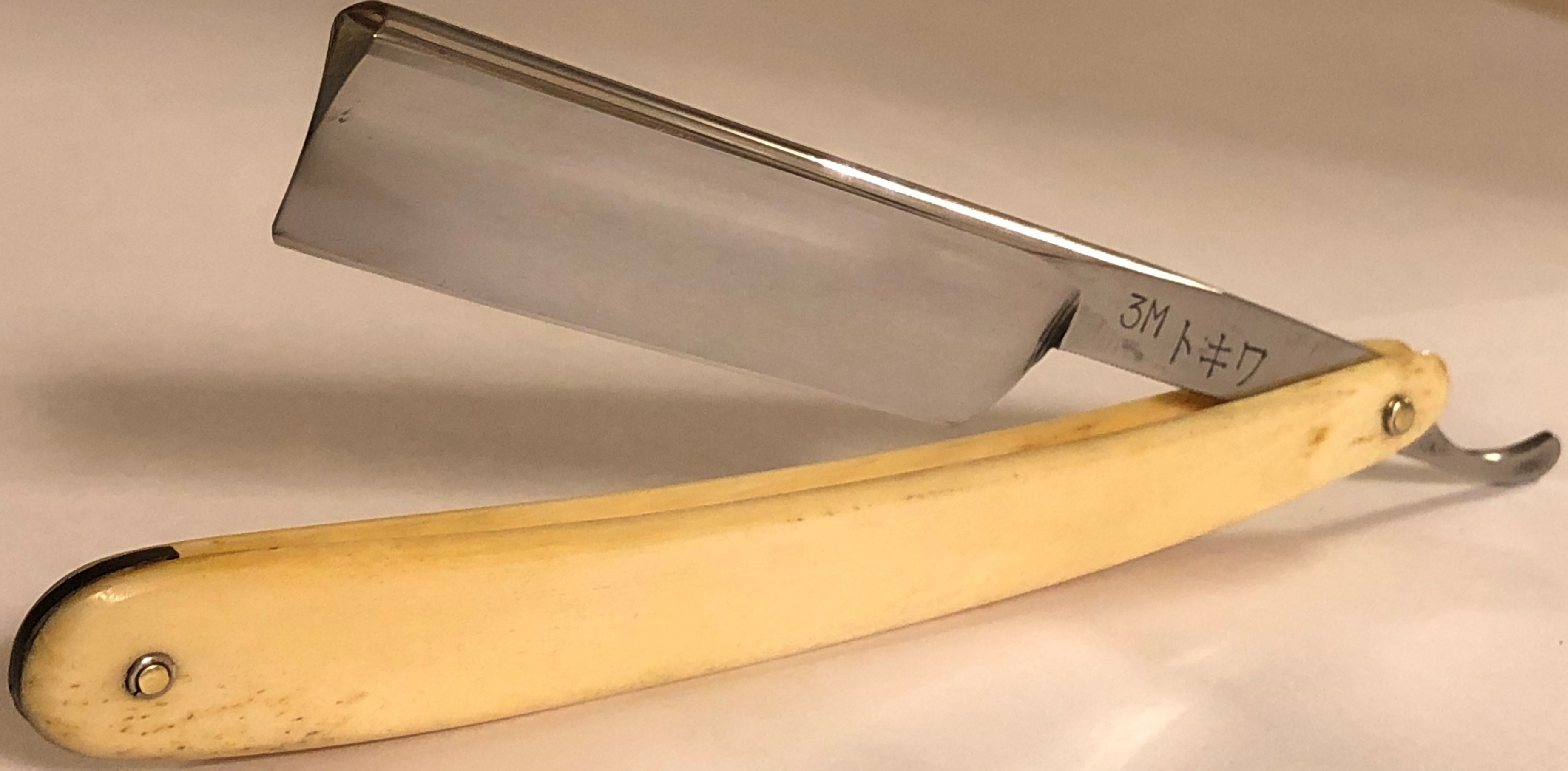 Изюминкой в компоновке данного раритета стал сюртук , пошива конца 19-го,начала 20-го веков.Имеется ввиду ручка из натуральной кости, от старинного донора. Оправа мощная, крепкая, тяжёлая, в идеальном состоянии.Пины удалось заново поставить оригинальные, от Ивасаки.Клинок в прекрасном состоянии,без видимых дефектов. Идеальная геометрия полотна:кромочка равномерна по всей длине.Сталь звонкая, отличного качества. По всем параметрам твердая, больше подошла бы для жёсткой щетины, но и для опытного пользователя будет очень неплоха. В общем и целом я доволен своей работой. На мой взгляд, отличная вещь для повседневного бритья.Заточена и готова к бритью.