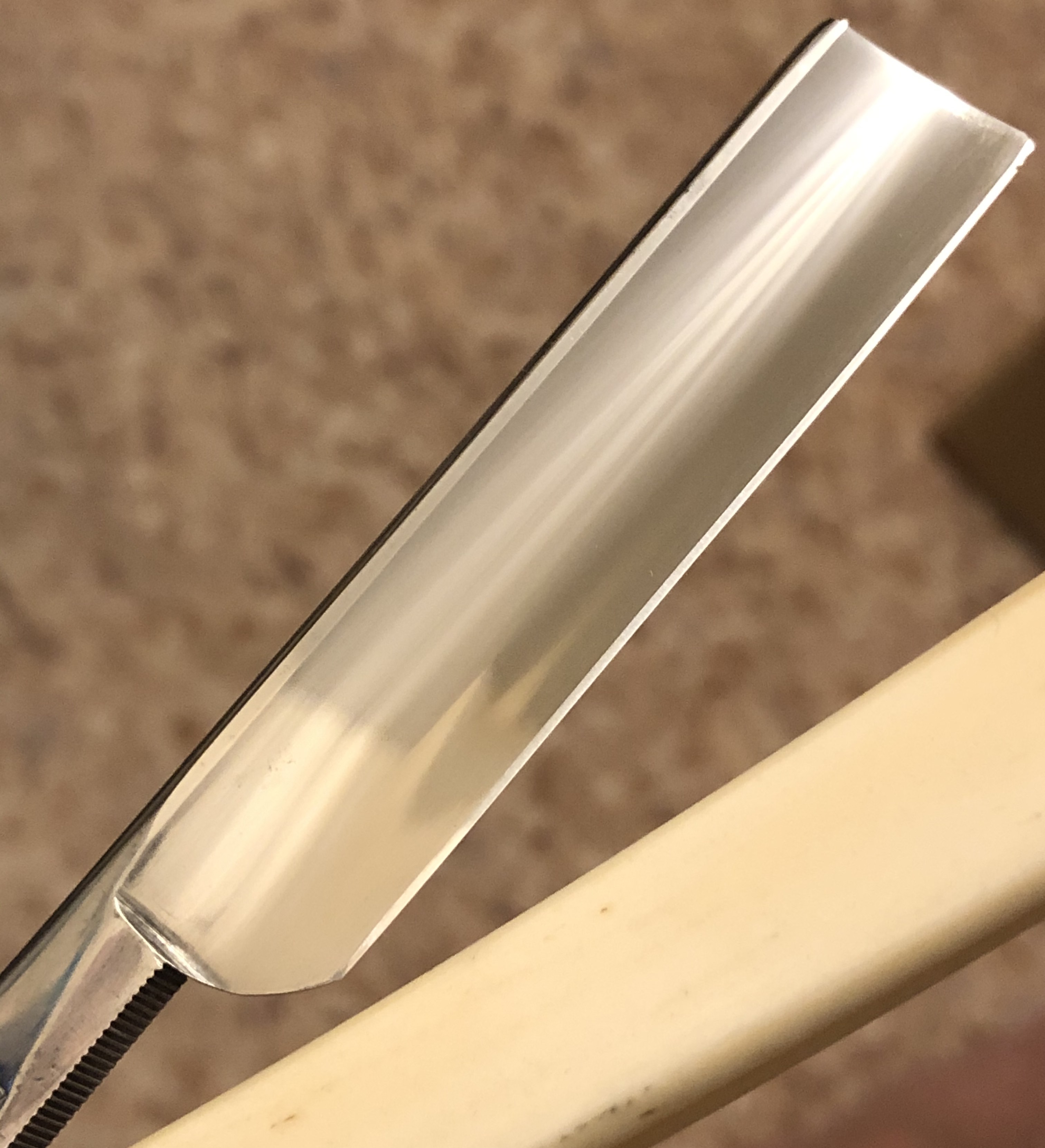 Не стал стачивать много "мяса", чтобы убрать все изъяны и рытвинки металла, а просто почистил и заточил.В целом клиночек чистый, за исключением небольшого количества у обушка.Кромочка равномерна по всей длине.Сталь очень неплохая в плане заточки, впрочем как и большинство французских бритв этого периода.Роговая оправа в очень хорошем состоянии, практически без отгрызанных мест. Массивная , тяжёлая бритва. Заточена и готова к бритью.