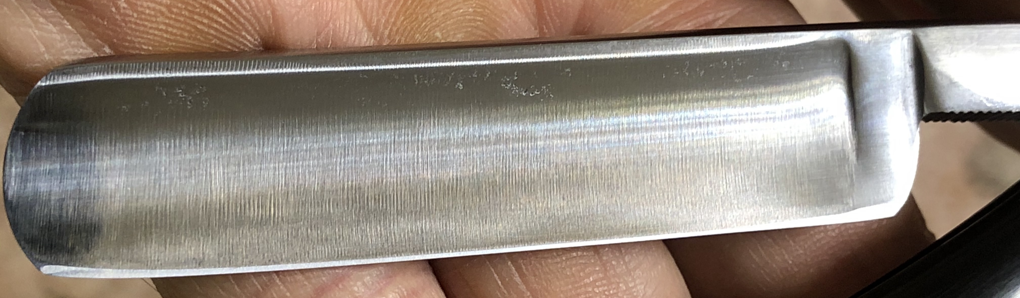 Не знаю, какое отношение имеет Австрия к производству этой бритвы , но она на 100% имеет японские корни.(Были и ранее у меня такие бритвы, и даже с родными коробочками,где было написано, что бритва произведена в Японии). Ширина полотна-20 мм Толщина обушка-6.5 мм Полная вогнутость. Углеродистая сталь. Примерно-50-70-е годы. Бритва находится в прекрасном состоянии,с еле уловимыми следами пользования.Практически вид непользованной.Не разбиралась.Только освежил полотно с обеих сторон от следов патины и окисления, от долгого хранения и отполировал район эрля.Отличная,"звонкая" сталь, идеальная геометрия:кромочка практически незаметна и равномерна по всей длине.Тяжёлая, практичная и относительно бюджетная бритва.Заточена и готова к бритью. Цена-8500 р с доставкой.ПРОДАН Spoiler Show Spoiler Show