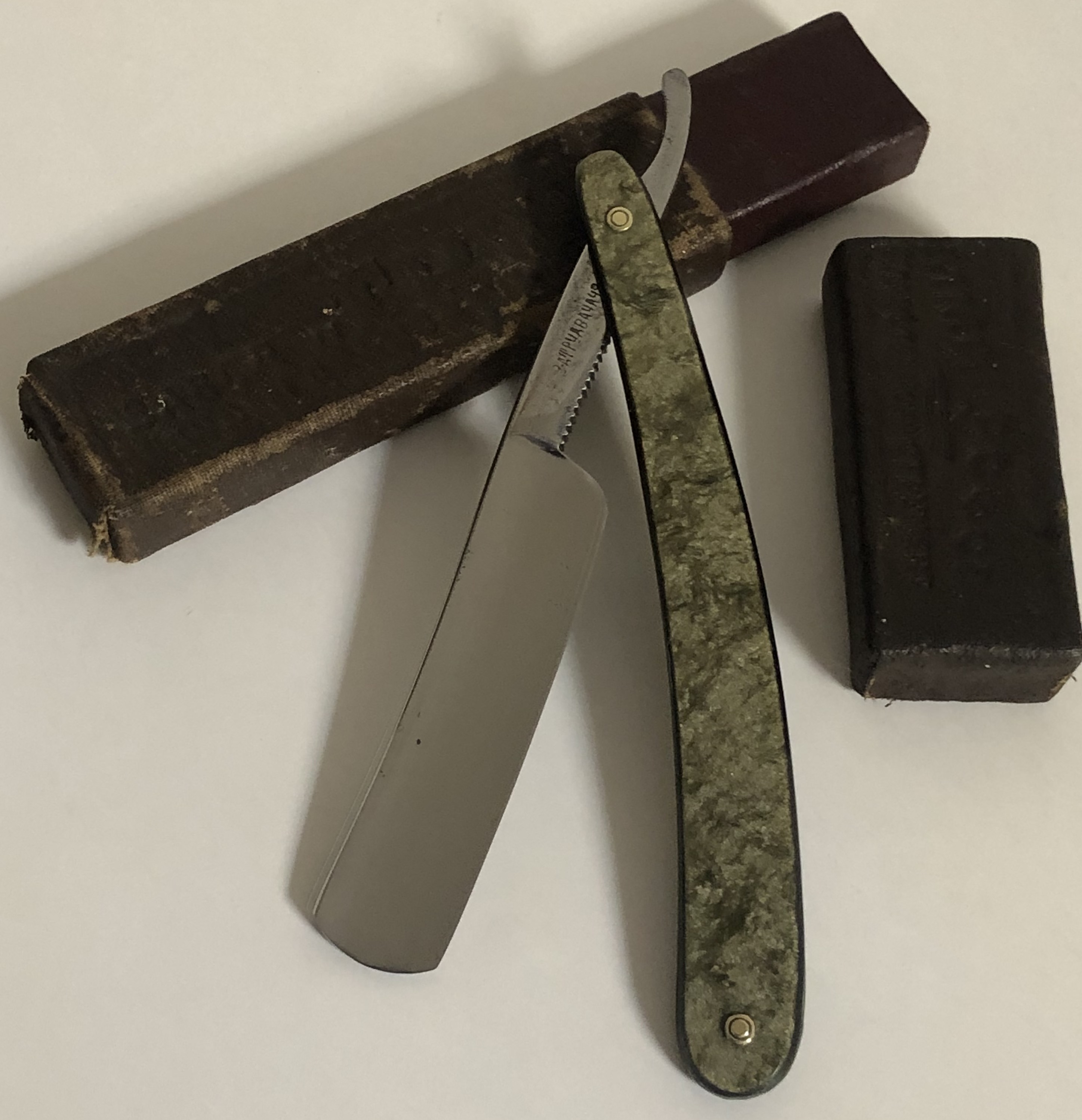 BURRELL CUTLERY C0.INC.ELLICOTTVILLE,N.Y. TOP FLIGHT-"Высший пилотаж" Ширина полотна-18 мм Толщина обушка-4.3 мм Полная вогнутость. Углеродистая сталь. Время производства:1940-1950гг. Спасибо Антону за описание истории этого бренда: viewtopic.php?f=31&t=2311&p=180836&hili ... ll#p180836 Бритва в прекрасном состоянии,без признаков пользования. (воронение эрля практически на месте)Немного освежил клинок от патины.Перебрал осевой пин и добавил внутренние шайбы.Эффектная оправа,с металлическими,ажурными накладками. Также,не стал убирать красивую потертость плашки, так бы "под старину".Сталь и кромка чистые, от всякого рода дефектов.В общем и целом неплохая бритва, во всех отношениях.Заточена и готова к броитью. Цена-6500 р с доставкойПРОДАН Внимание! Важная информация! Spoiler Show