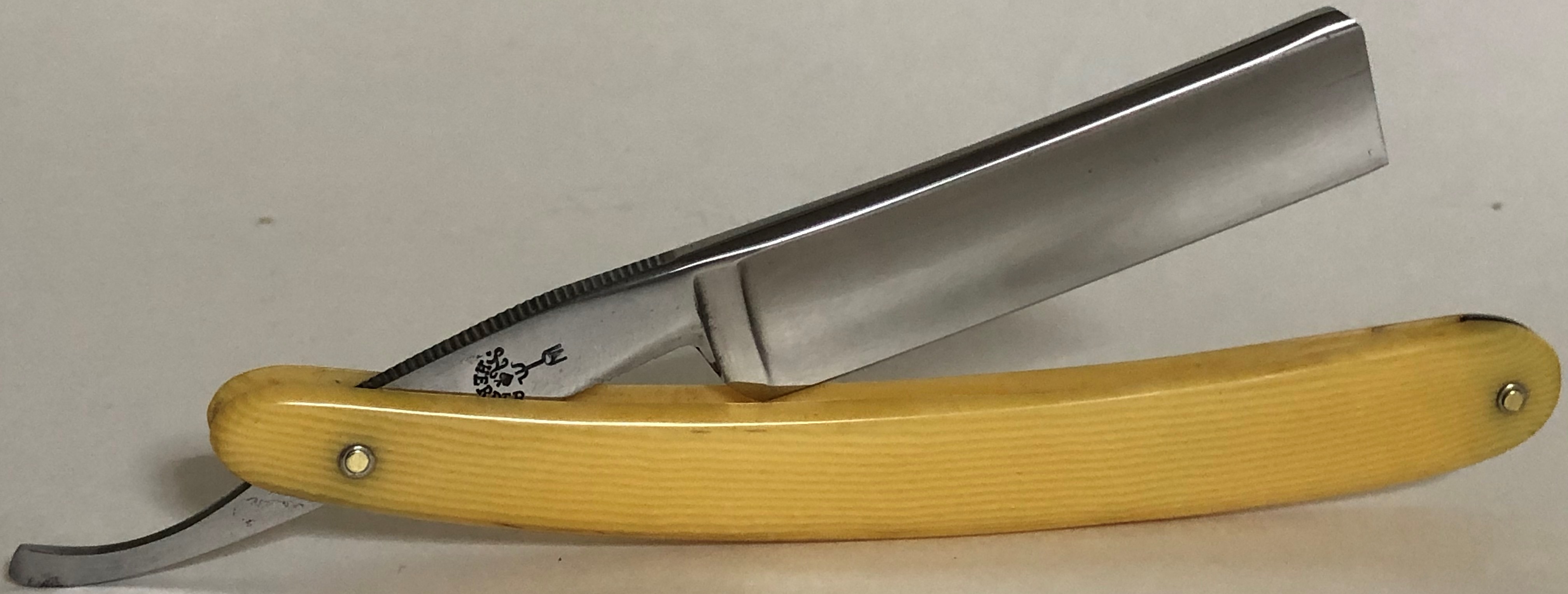 Бритва не разбиралась, а тольно немного чистилось полотно.Какой именно бренд, трудно разобрать, по причине потертости пластиковых накладок, от времени.Можно разобрать только-"Tokyo-Japan" и на обратной стороне-"for barber use-first quality".Исходя из опыта тестирования подобных бритв в прошлом, могу сказать, что бритвы подобного типа имеют отличную"звонкую" сталь, прекрасно точатся и очень удобны в пользовании и уходе, из за своих накладок на эрле.Бритва пользованная, но эксплуатировалась аккуратно.Сталь чистая, без видимых дефектов.Геометрия кромки на уровне. Бритва идеально могла бы подойти для новичка в качестве качественной и совершенно недорогой вещи.Заточена и готова к бритью.