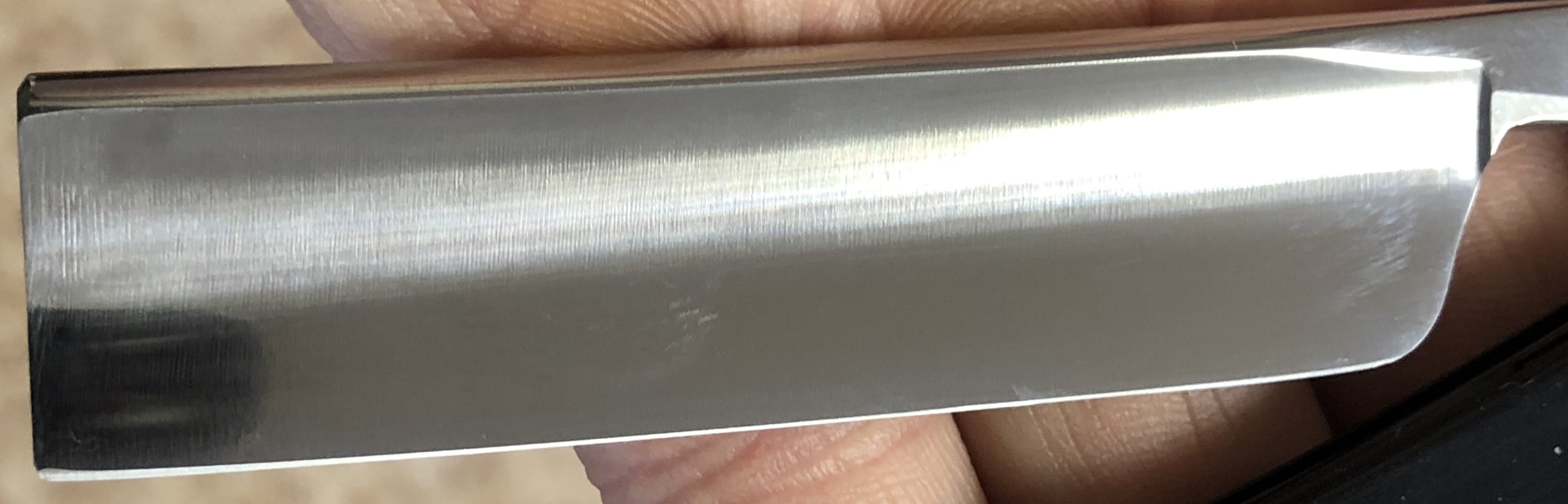 Никаких видимых дефектов не заметил. Все ,как вчера с производства.Элегантная форма клинка, в массе своей несвойственная японским бритвам, в виде тонкого эрля, широкого полотна, с глубокой выработкой .За счет толстого обушка бритва достаточно тяжёлая, что даёт возможность чувствовать ее в руках, при бритье и не резаться часто.Идеальная форма клинка:кромочка равномерна по всей длине и практически незаметна.Отличная "звонкая" сталь способна выдавать качественное и мягкое бритьё. Заточена и готова к бритью.