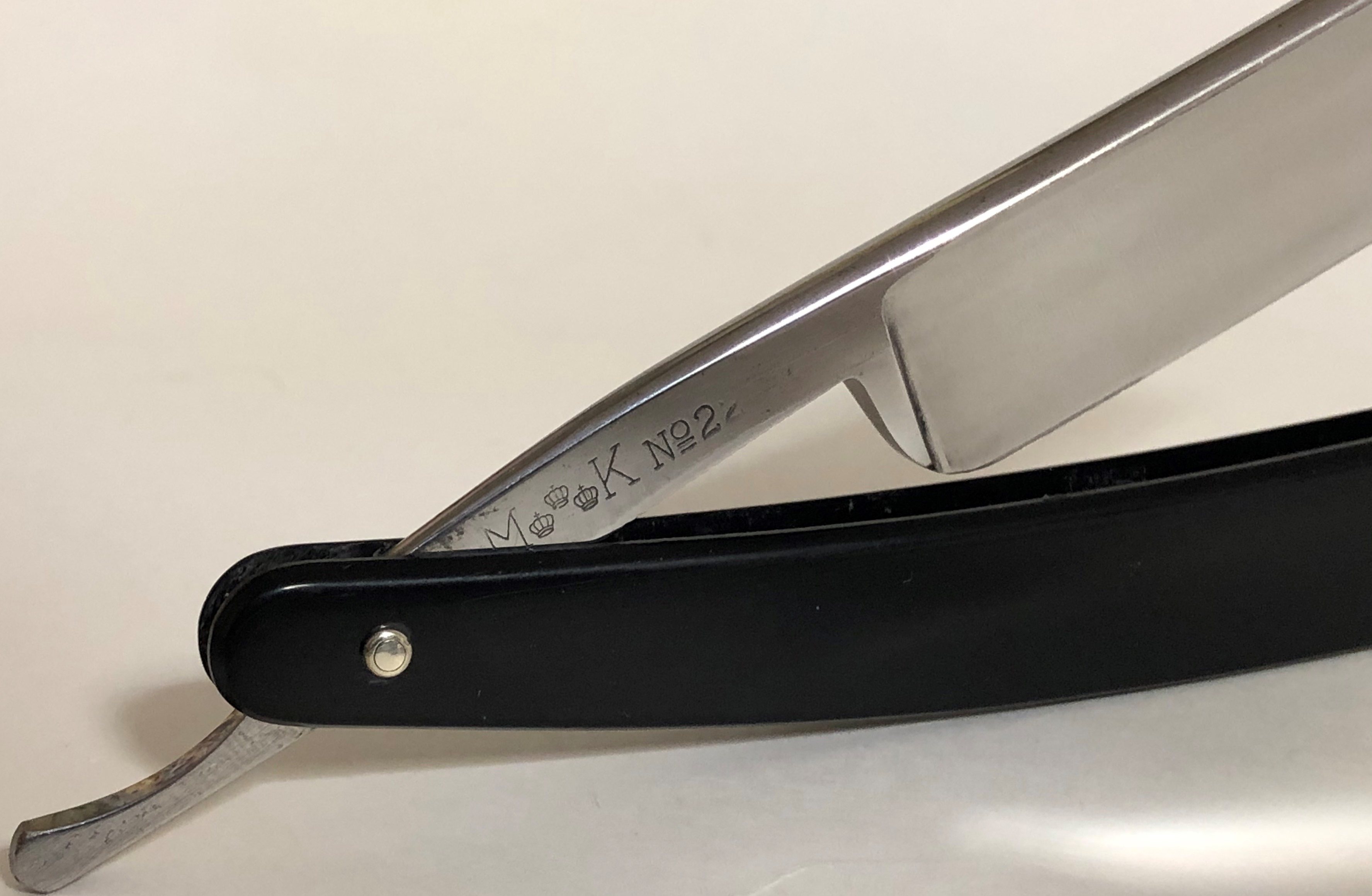 Следов пользования не заметил. Обушок находился в первозданном виде, без следов абразива.Но, пришлось разобрать, немного почистить металл от остатков патины и других дефектов и заново собрать, поставив нормальные втулки, с добавлением внутренних шайб.При шлифовке грани и переходы на "ступеньку" были соблюдены и не зализаны.Если несколько "точек времени" и осталось,но практически незаметны , если смотреть в натуре и не представляют никакого вреда в будущем.Идеальная геометрия клинка:кромочка равномерна по всей длине и еле заметна.Коробочка неоригинальная.Бритва заточена и готова к бритью.
